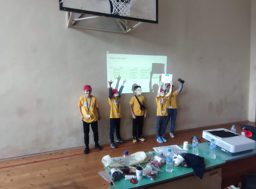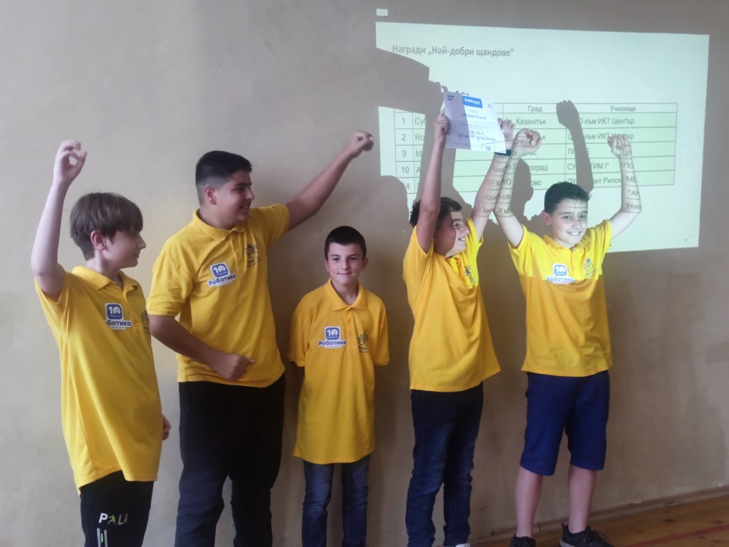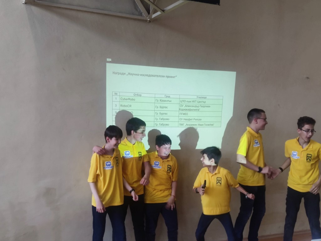 Най-щастлив е отборът CyberRobo, спечелил награди във всички категории на състезанието – „Екипна игра“, „Робо дизайн“, „Научно-изследователски проект“, „Робо игра“ и даже и „Най-добри щандове“. И не само това – беше един от четирите отбора с най-много точки на управлението на робота. При последващите 2 рунда от по 2 минути, пред всички, със ръкопляскания и скандирания на публиката, станаха първи! Поздравления за Божидар, Борислав, Борис, Иван, Йоан и Денислав! Отборът е и ветеран за Детската акдемия по програмиране и роботика и успешен участник също и в First Lego League.
