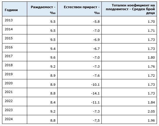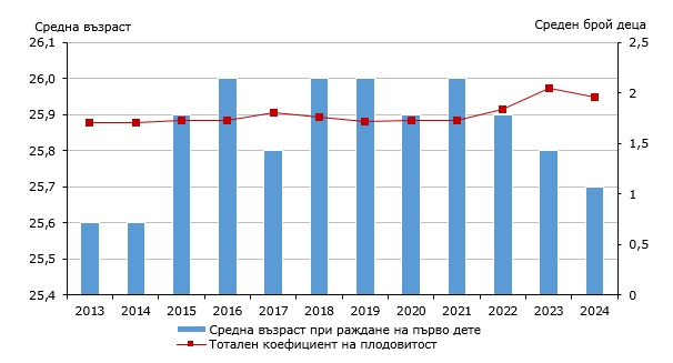 През 2024 г. средната възраст на жените при раждане на първо дете е 25.7 години. В сравнение с 2023 г. се e намалила с 0.1 години. Средната възраст на жените при раждане на дете е 27.8 години.
