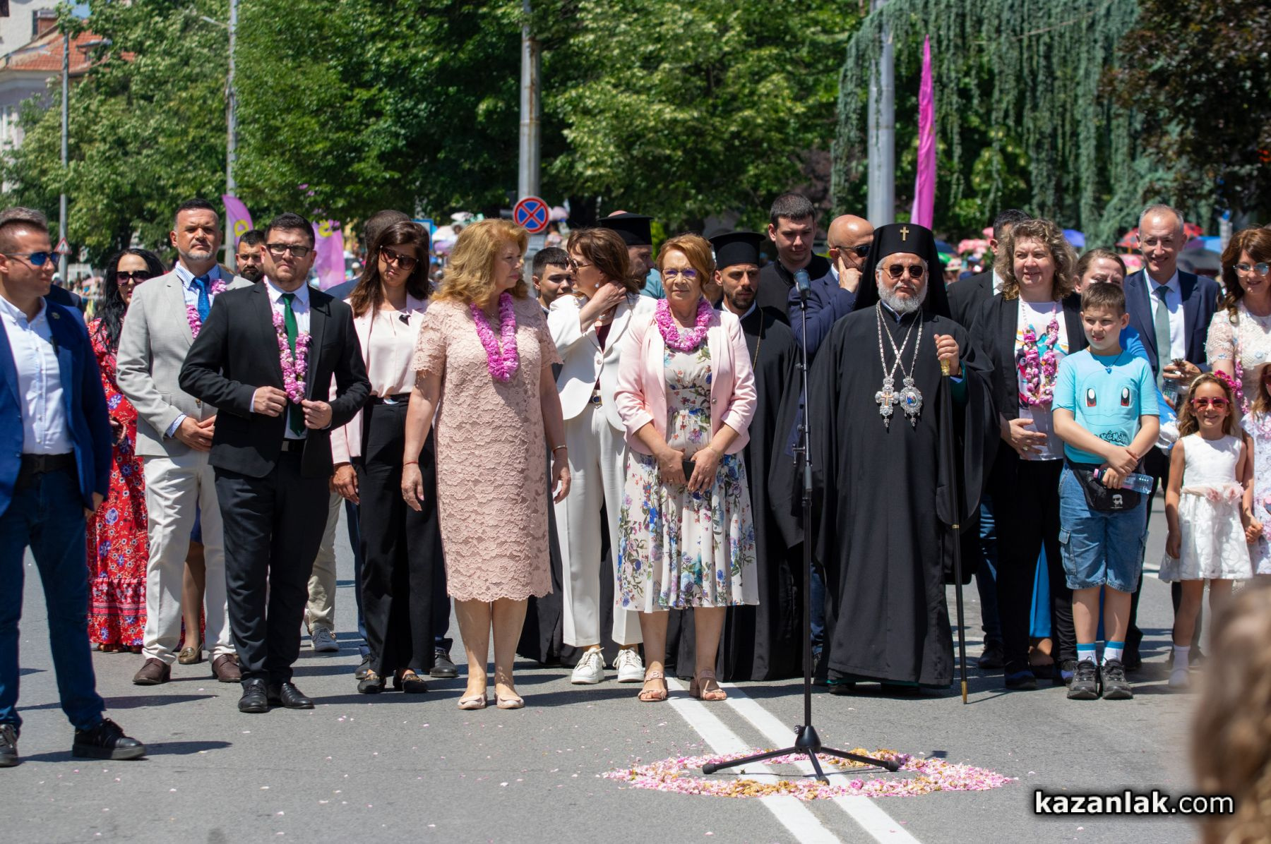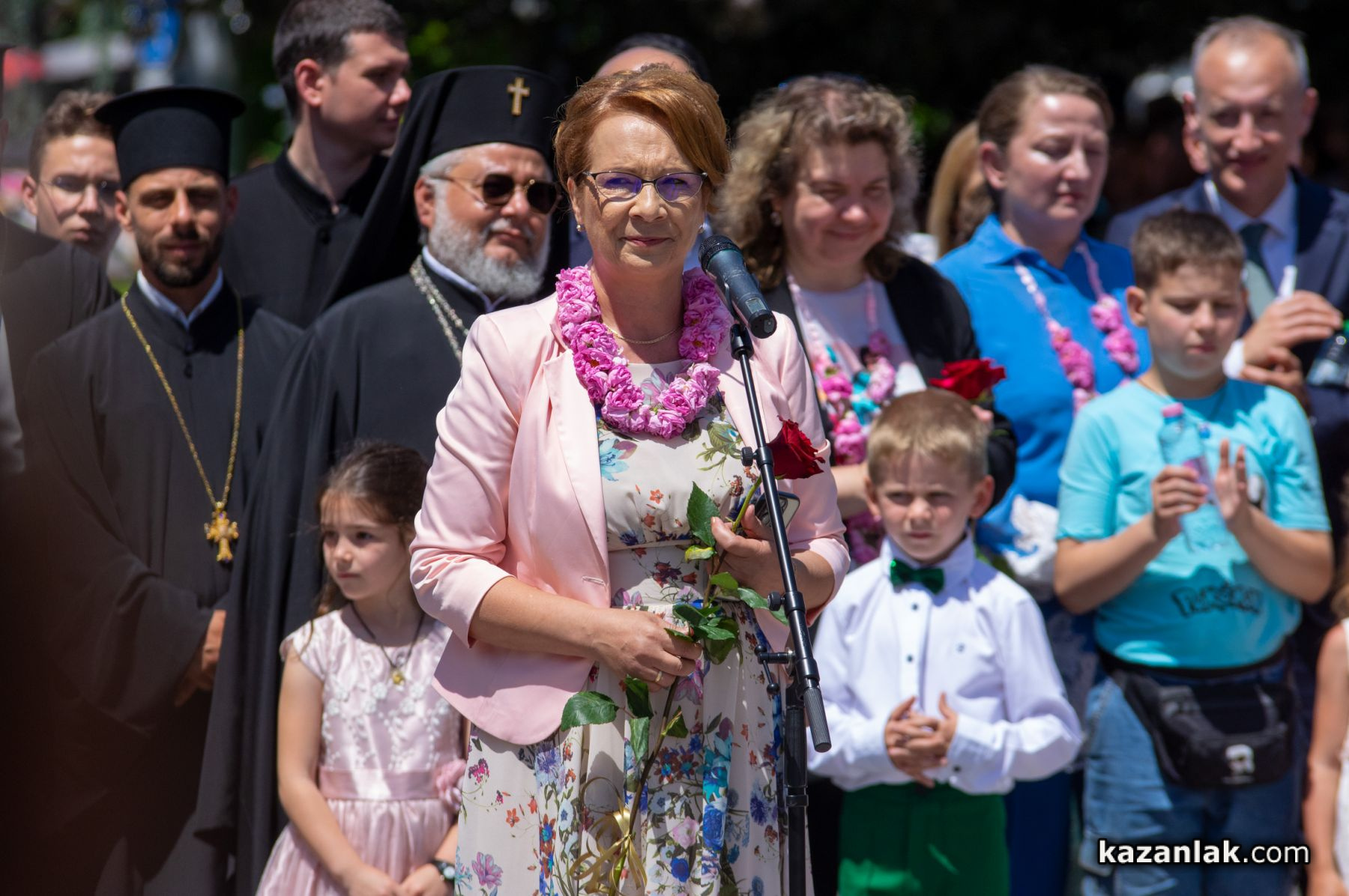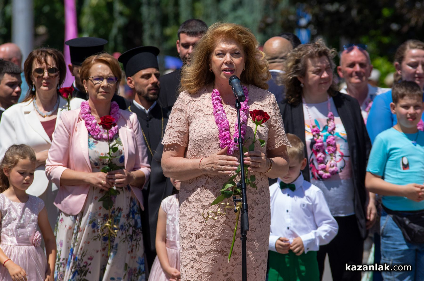 Талантливи деца от детските градини на Казанлък рецитираха стихове за родния град и допринесоха все по-емоционални и вълнуващи моменти към празничната атмосфера. Десетки официални гости, водени от стопанина на столицата на розите - кметът на община Казанлък Галина Стоянов - поздравиха многобройната публика с топли думи.
