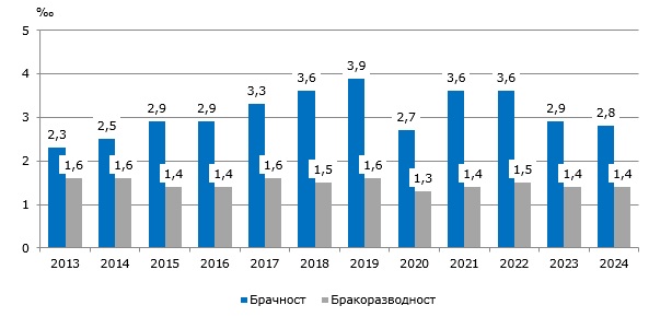 Коефициента на брачност , през 2024 г. е 2.8‰, като спрямо 2023 г. намалява с 0.1‰.