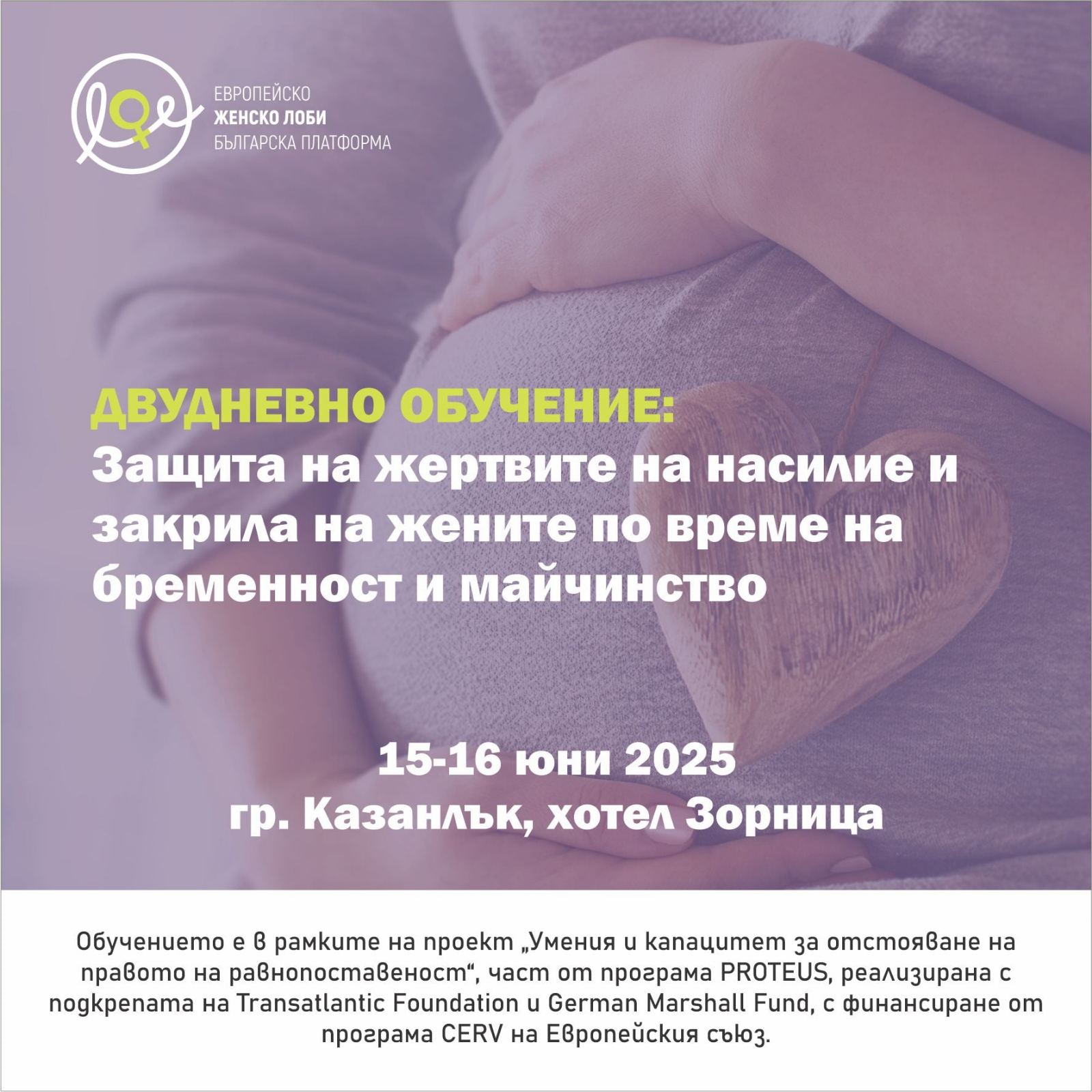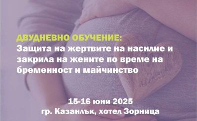 Семинар „Защита правата на жертвите на насилие и закрила на жените по време на бременност и майчинство“ ще се проведе на 15 и 16 юни в конферентната зала на хотел “Зорница“, Казанлък.