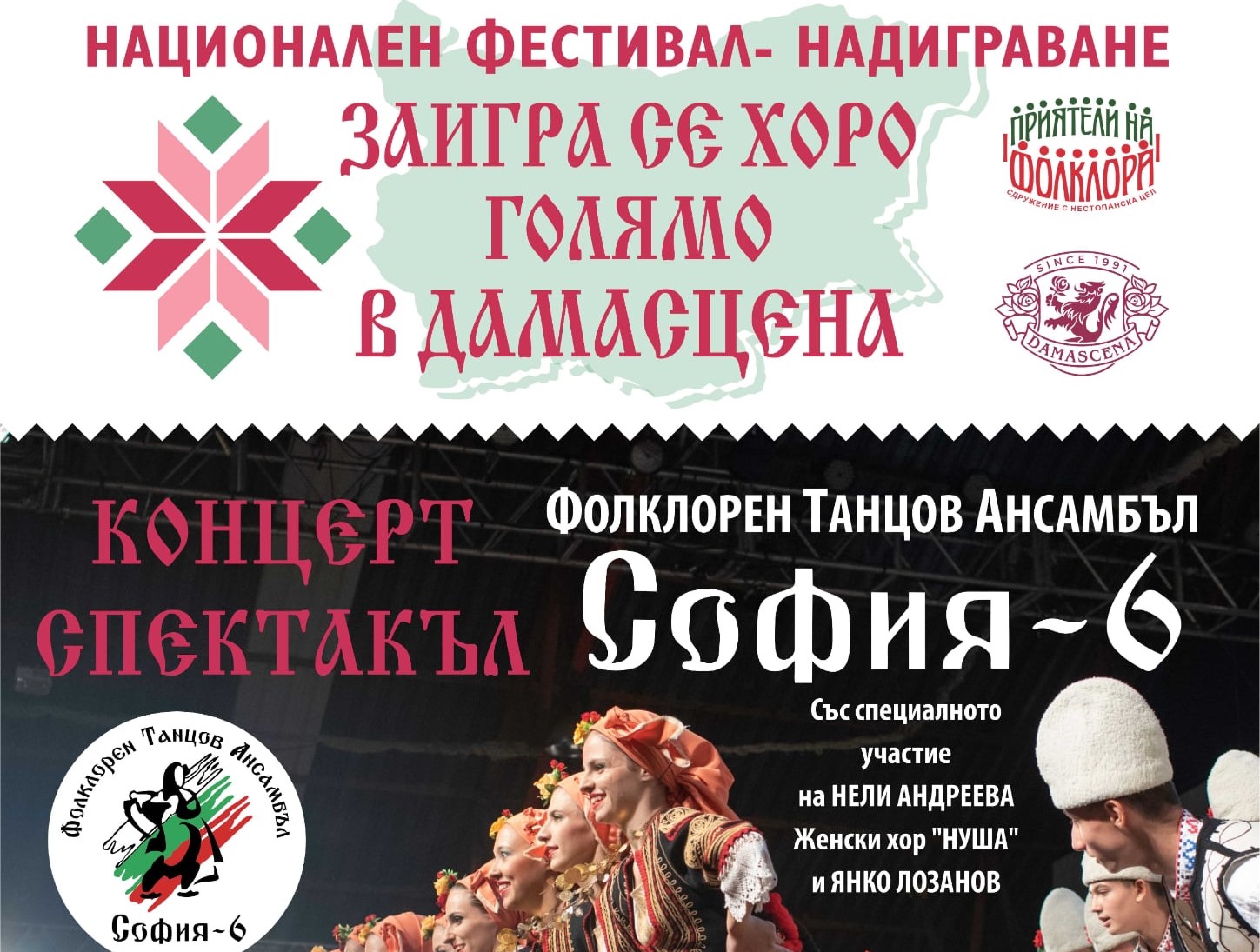 Подарете си едно невероятно преживяване на 27 юни /петък/, когато от 20:00 часа на сцената на Етнографски комплекс „Дамасцена“, Фолклорен танцов ансамбъл „София-6“ ще представи своя изключителен концерт-спектакъл, със звездното участие на Нели Андреева, Женски хор „Нуша“ и Янко Лозанов. Събитието е част от Националното надиграване "Заигра се хоро голямо в Дамасцена".