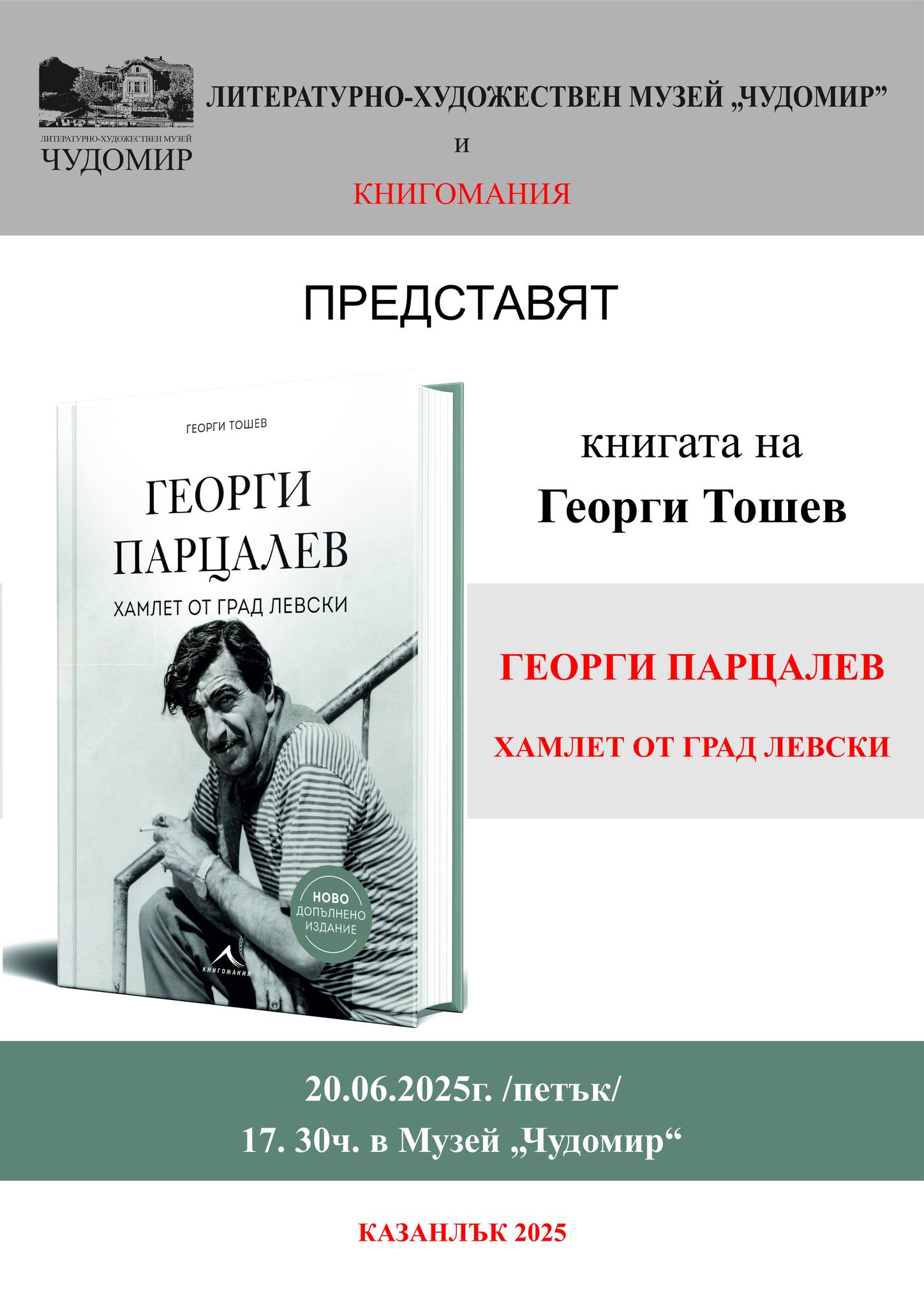 Този петък, 20 юни, в ЛХМ "Чудомир" ще гостува журналистът Георги Тошев, за да представи книгата си за бележития артист Георги Парцалев "Хамлет от град Левски".