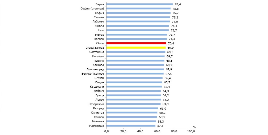 По брой на заетите лица област Стара Загора е на шесто място в страната, след област Благоевград (126.2 хил.) и преди област София (105.7 хил.), а по коефициент на заетост – на дванадесето място (виж фиг. 1), след област Благоевград и Плевен (51.5%) и преди област Шумен (50.9%).