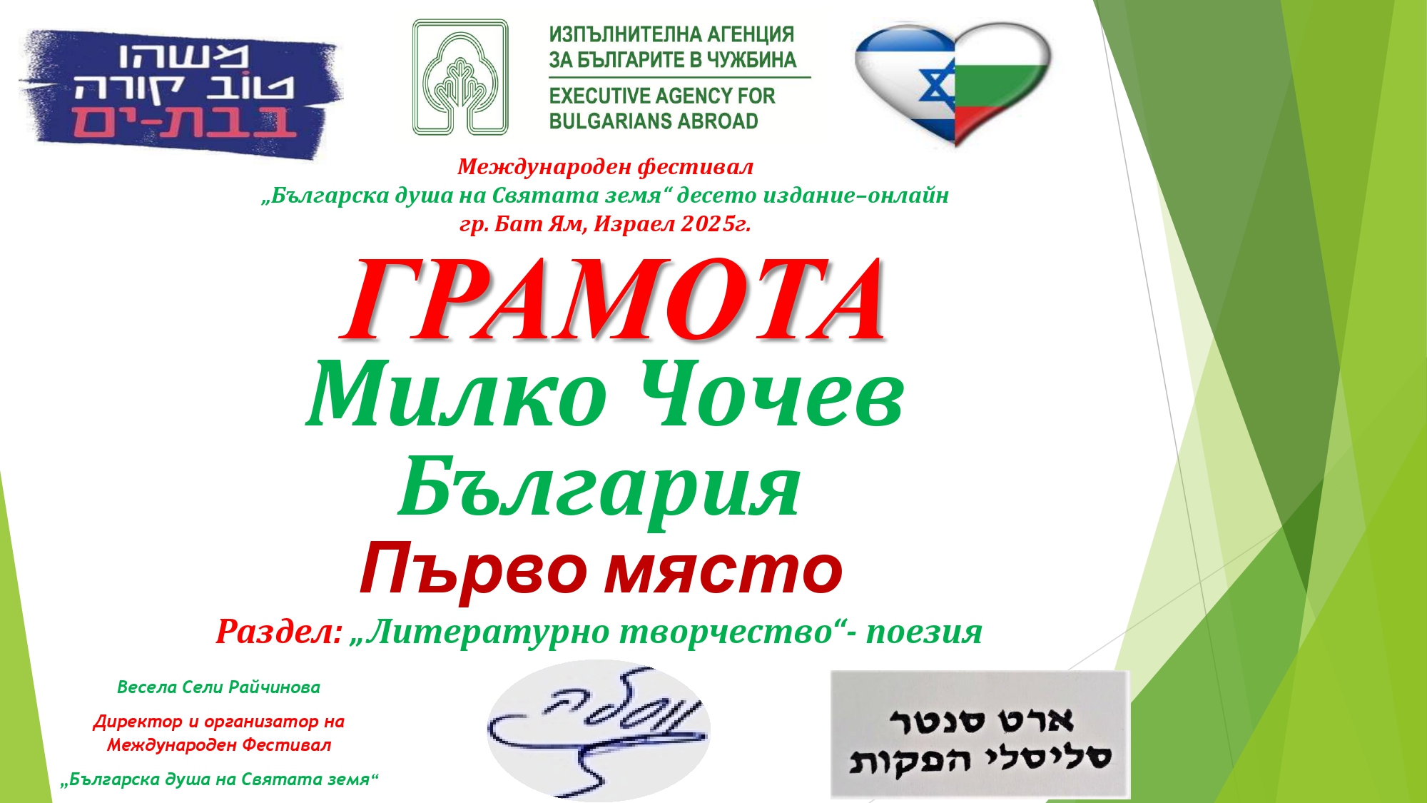 Казанлъшкият автор Милко Чочев спечели отново първо място за поезия в Международния литературен конкурс „Небесни меридиани”, който е част от десетото юбилейно издание на Международния фестивал „Българска душа на Святата земя” – гр. Бат Ям, Израел 2025г. Конкурсът протече при изключително високо ниво на художествена стойност и тематична дълбочина на постъпилите творби.