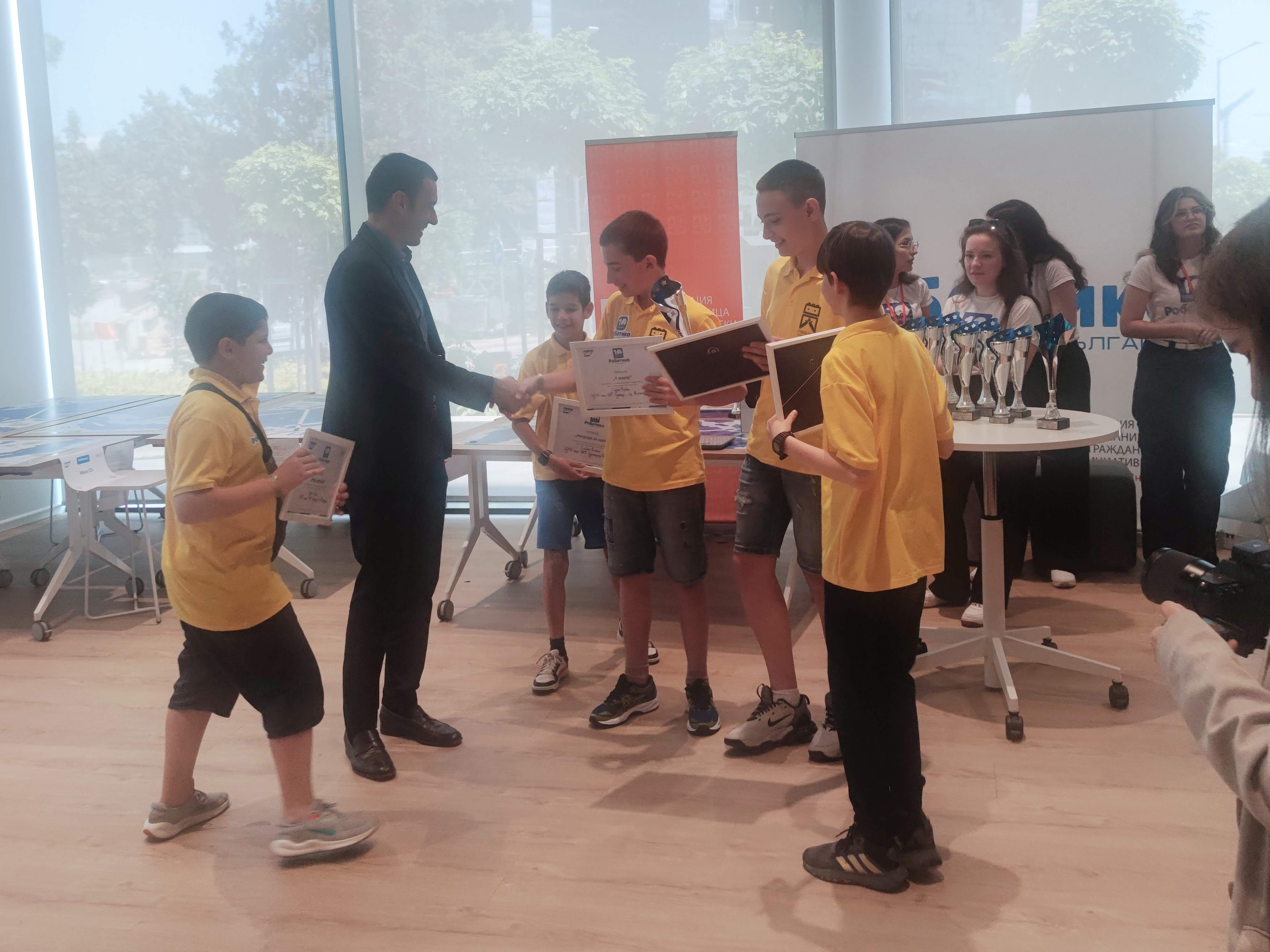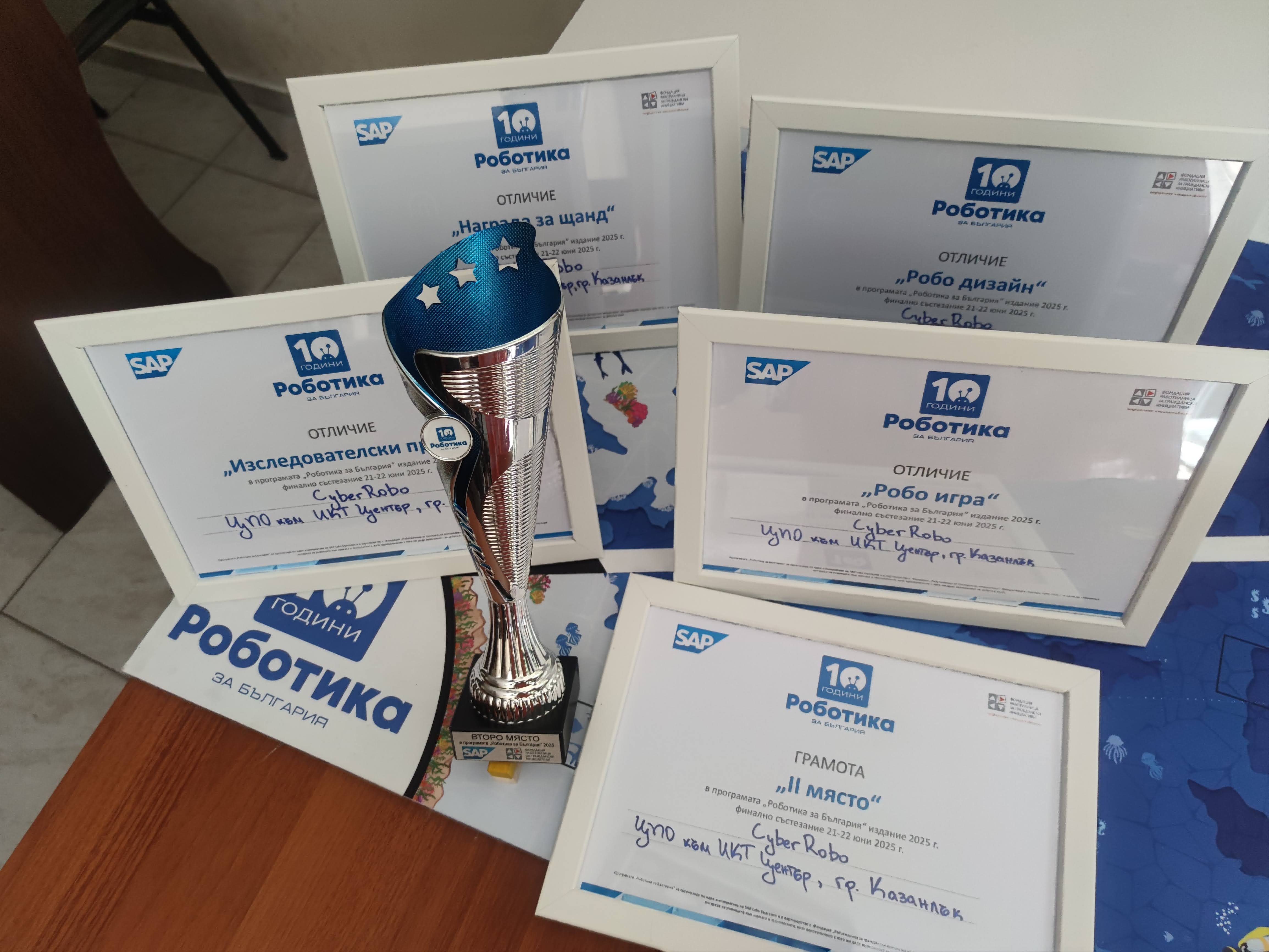 Учениците Борислав Бакоев, Иван Иванов, Божидар Добрев, Йоан Георгиев и Денислав Демиров успяха да постигнат целта си, извоювана с много усърдие и труд. Три години след като вдигнаха бронзова купа през 2022-а, отново са на върха! На юбилейния 10-годишен фестивал на програма „Роботика за България“ се изкачиха едно стъпало по-нагоре и са втори в дивизията на опитните отбори „Lego Spike A“! Бяха отличени в категория: