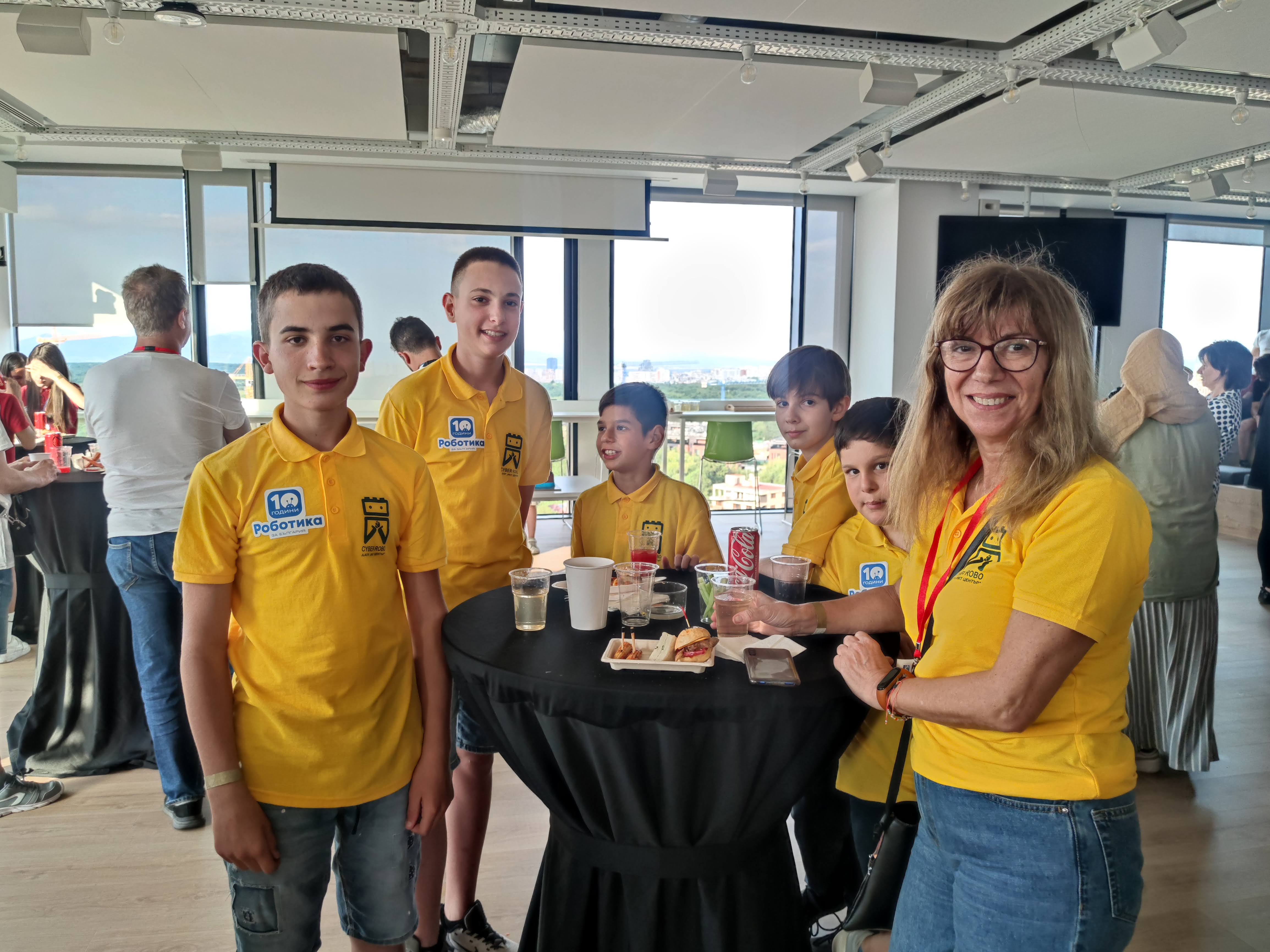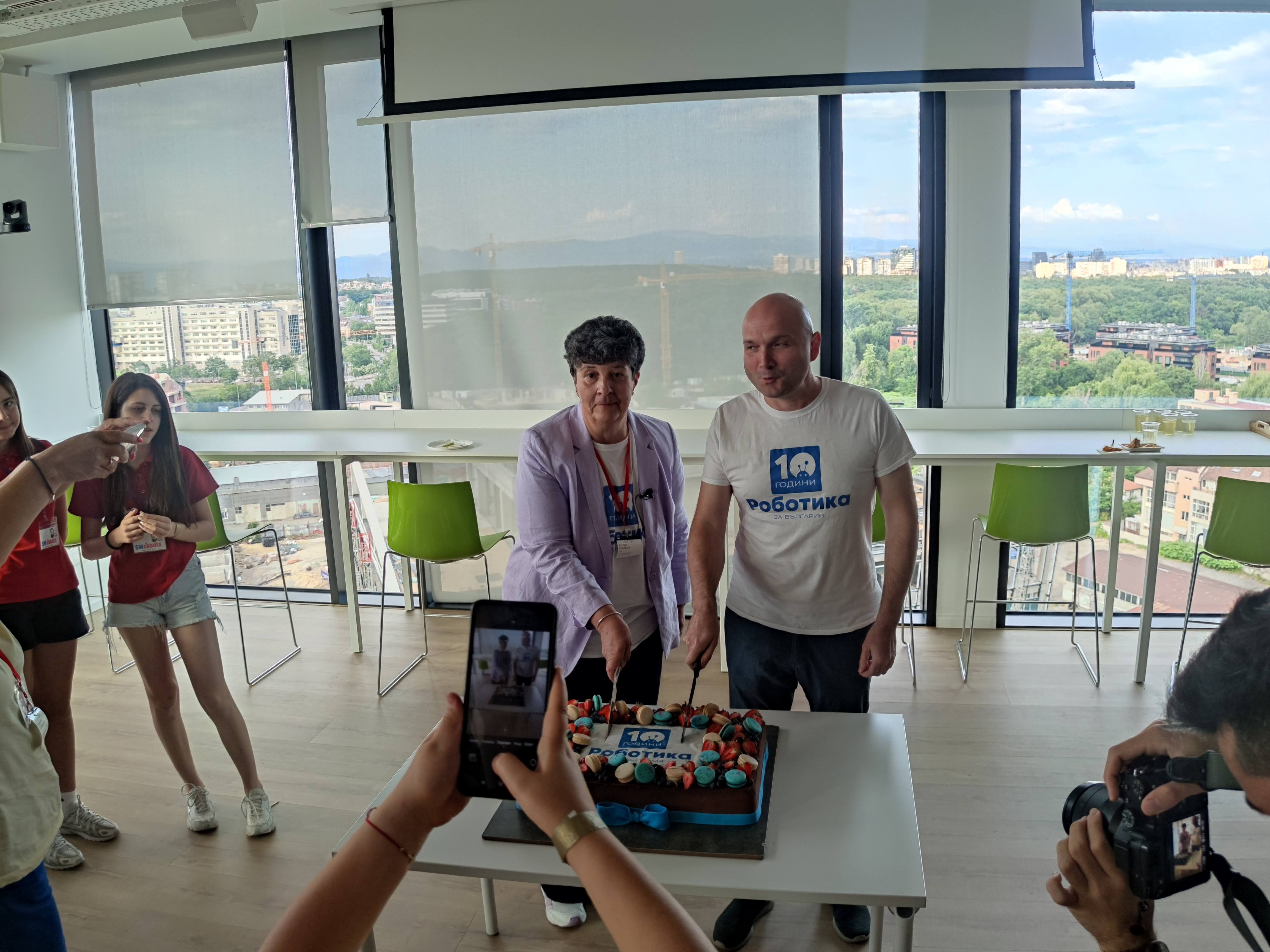 Г-н Радослав Николов, който присъства неотлъчно и в двата дни 21 и 22 юни на състезанието също отправи много мъдри слова към участниците, обръщайки внимание на принадената скрита стойност на техните участия – не само конструирането, програмирането и управлението на роботите научават учениците, а и да презентират, да изследват, да създават научни проекти, да са наблюдателни и находчиви, както и да общуват и се забавляват заедно! И забавленията бяха като за Юбилей! Бяхме поканени на парти, на 10-я етаж на сградата на SAP labs на хубава вечеря, завършваща с голяма торта, пуканки и сладолед. Разбира се имаше и официални приветствия от ръководителите на SAP labs и ФРГИ, музикална програма, както и демонстративни опити по химия и фойерверки на голямата тераса с изглед към града. Не пропуснахме да си направим и артистична снимка.