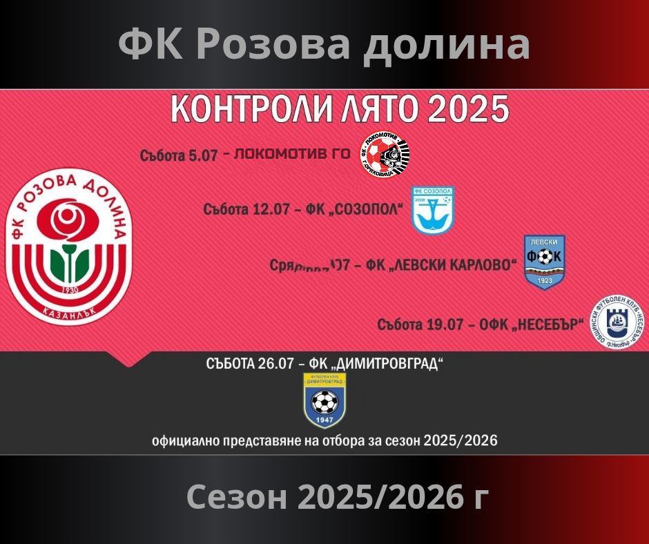 Старши треньорът на „Розите“ Атанас Апостолов е планирал 5 контролни срещи в програмата на отбора. Първата от тях е обявена за 5 юли срещу Локомотив (Горна Оряховица). След това на 12 юли е предвидена среща срещу отбора на Созопол, на 16 юли с тима на Левски (Карлово), 19 юли Несебър и на 26 юли срещу Димитровград.