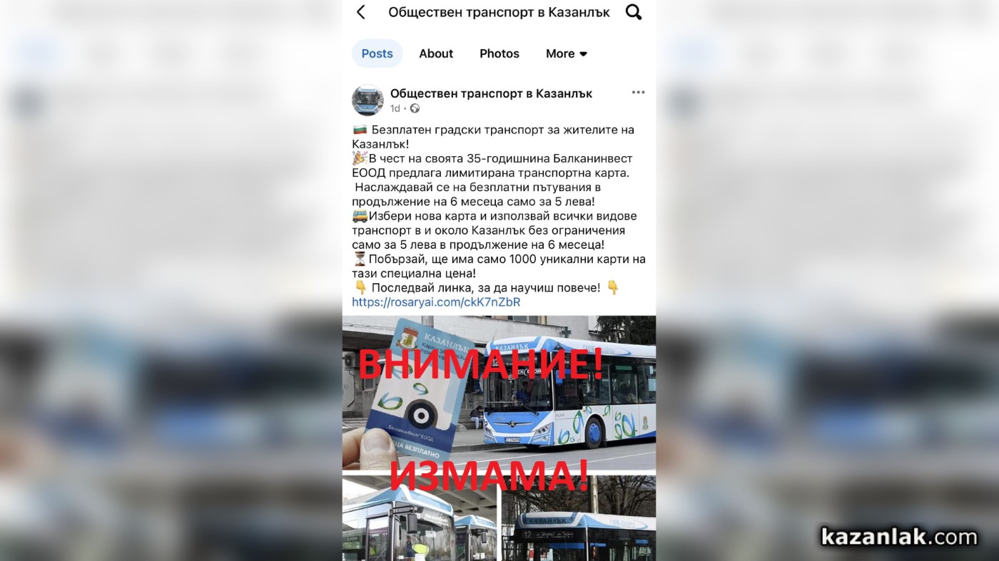 От общинско дружество „Балканинвест“ ЕООД, основен превозвач в Община Казанлък, апелират да не се поддавате на измамата в социалните мрежи за промоционални карти.