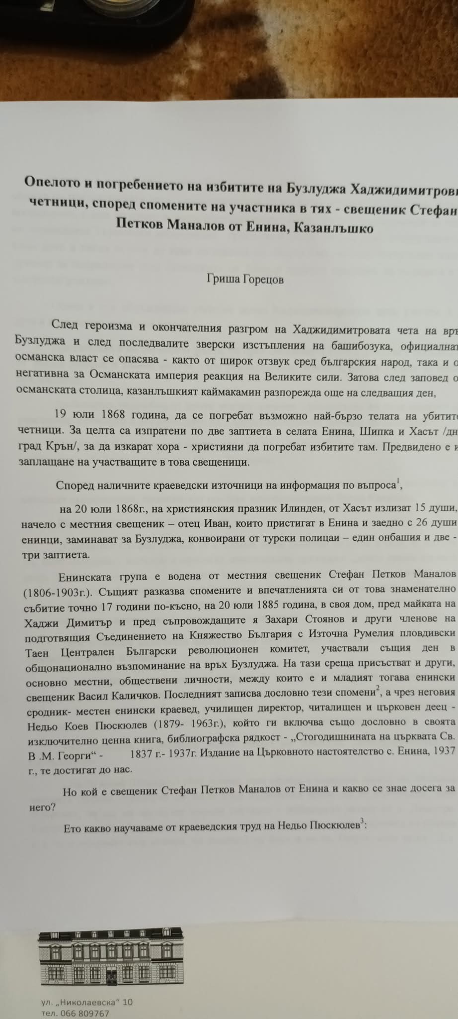 С удоволствие и радост съобщаваме, че сред поканените и участвалите с доклад бе и официалният представител на енинското КЛИО, професионалният историк и краевед Гриша Горецов (същият, по семейни здравословни причини, не можа лично да участва, а докладът му бе представен пред аудиторията на конференцията от неговия колега от Сливен Илиян Михов-родственик на Хаджи Димитър, на когото благодарим за колегиалния жест).