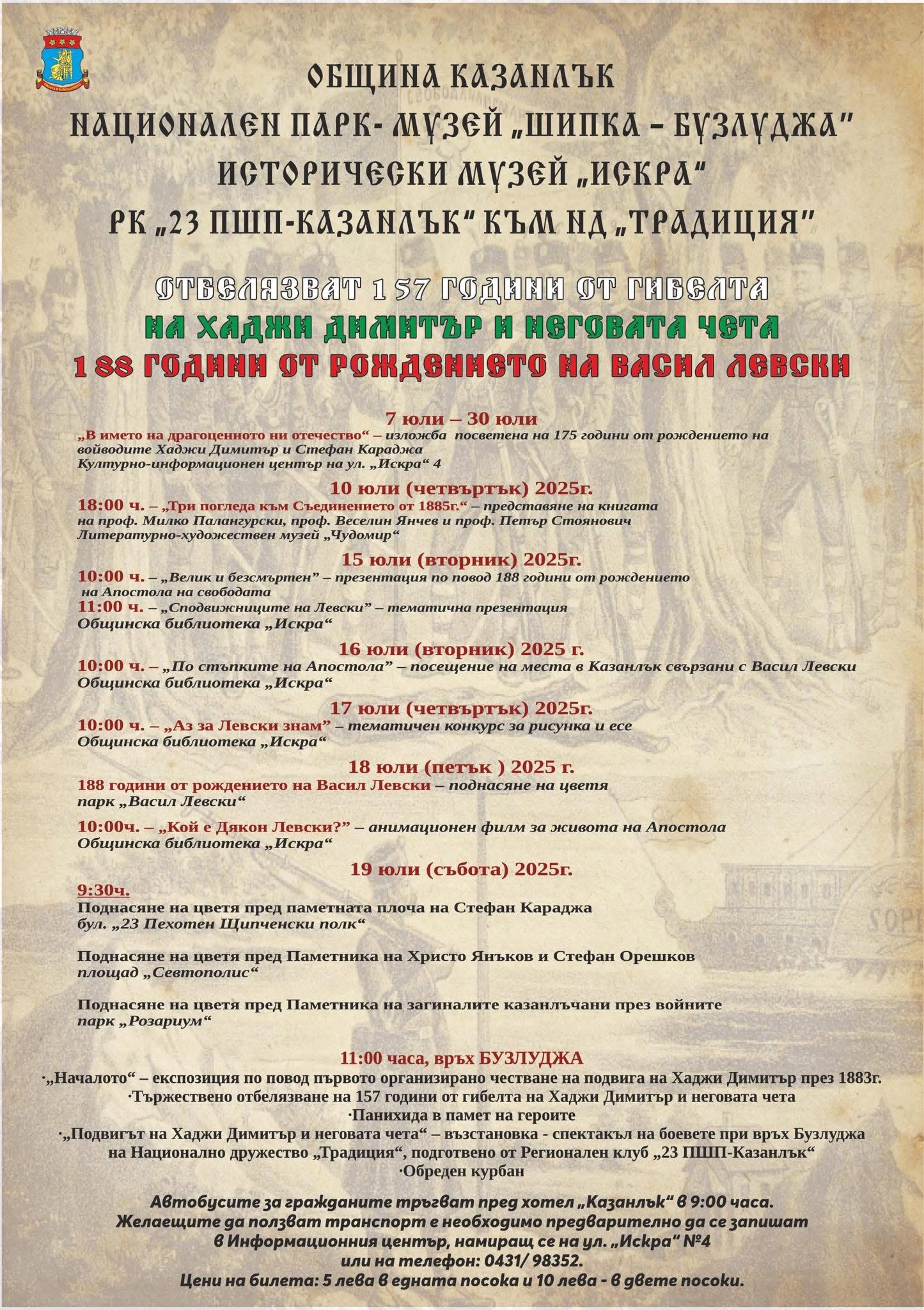 Община Казанлък кани всички родолюбиви българи да се присъединят към традиционното тържествено отбелязване на 157 години от подвига на Хаджи Димитър и неговите четници на 19 юли 2025 г. /събота/ от 11:00ч. пред паметника на българския войвода на връх „Бузлуджа“!
