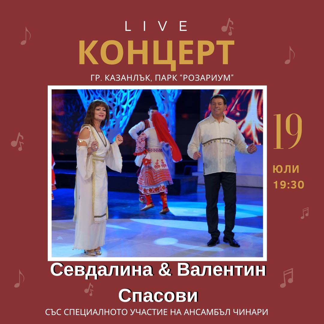 Концерт на Севдалина и Валентин Спасови ще донесе на Казанлък много емоции и споделени музикални вълнения. Той ще състои н 19 юли (събота) в 19:30 часа в парк “Розариум”.