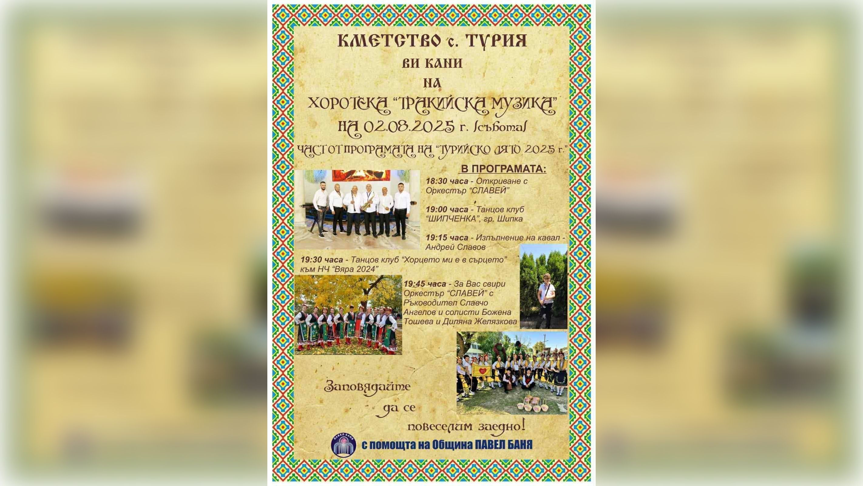 Кметството на село Турия кани жителите и гостите на населеното място на Хоротека „Тракийска музика“, която ще се състои на 2 август 2025 г. (събота) като част от културната програма „Турийско лято 2025“, съобщават организаторите.