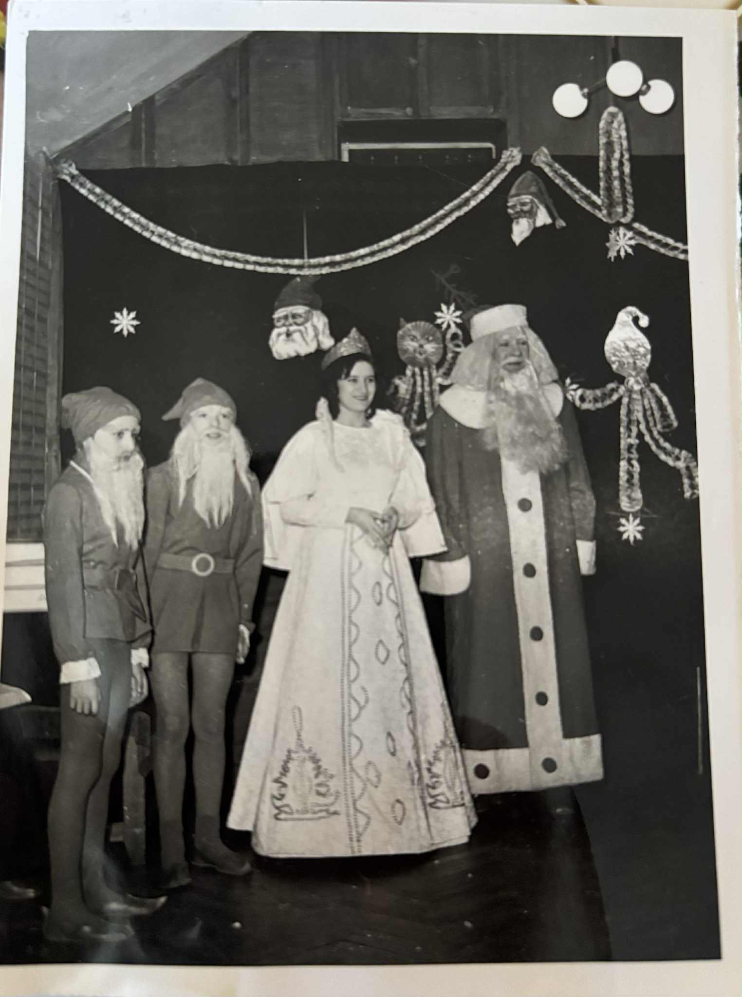 На черно-бялата снимка Лалев е Дядо Коледа, а Дерменджиева е Снежанка в читалище „Искра“.