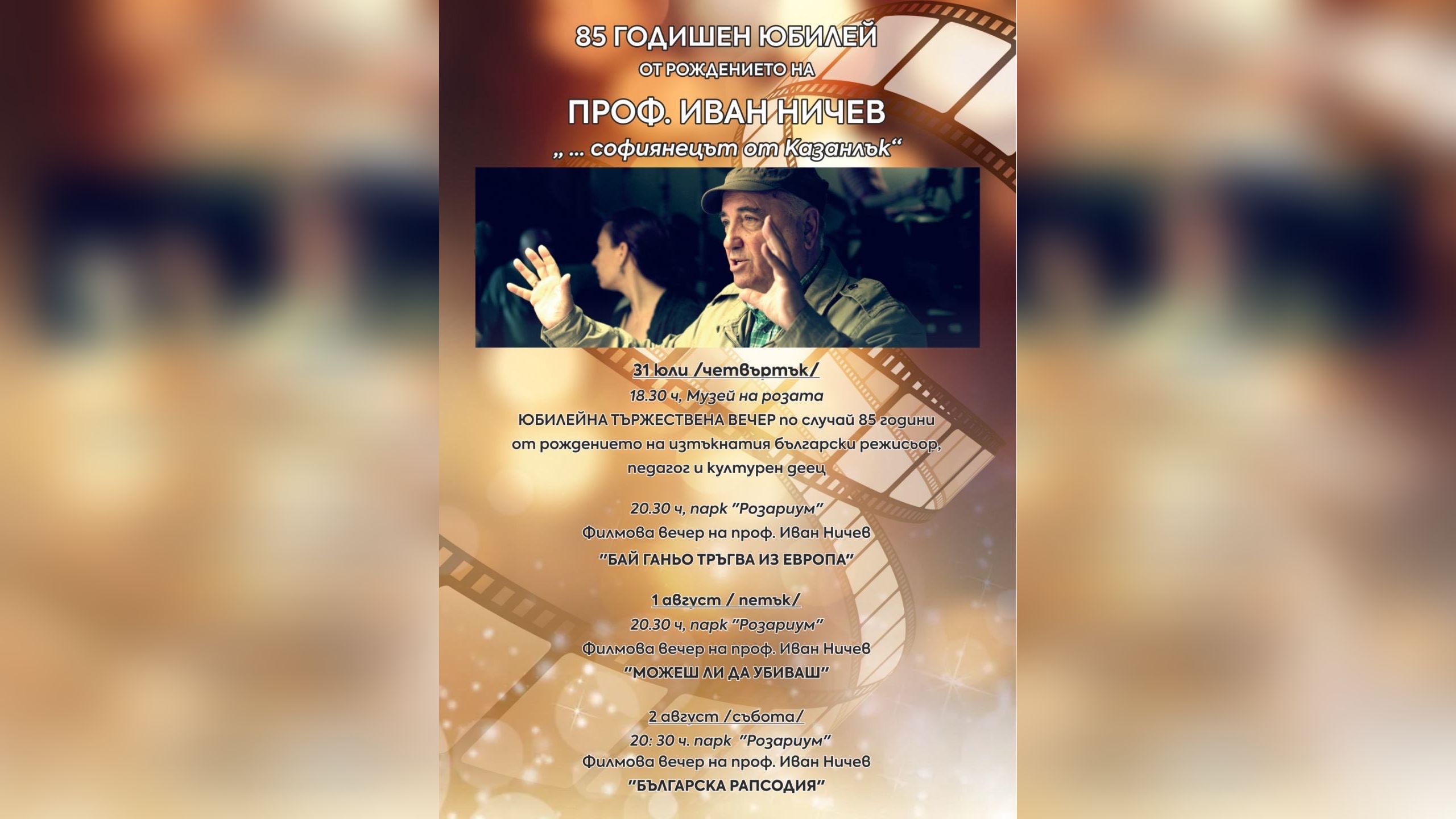 Събитията ще се проведат в периода 31 юли – 2 август под надслова “…Софиянецът от Казанлък“ и ще включват специални прожекции на едни от най-знаковите филми на проф. Ничев, както и тържествена юбилейна вечер.