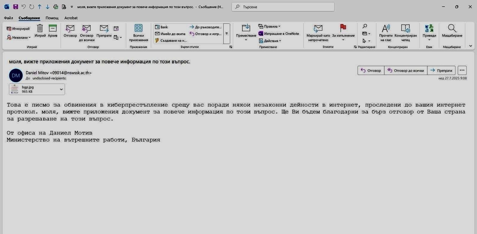 Разновидност на фишинг атака чрез имейли се разпространява активно в интернет пространството от няколко дни, този път от името на МВР. Измамните съобщения са изпращани или подписани от името на министъра на вътрешните работи Даниел Митов, посочват от институцията.
