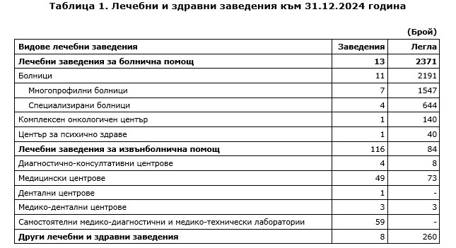 В сравнение с предходната година броят на заведенията остава непроменен, а леглата в тях намаляват с 34, или с 1.4%. Болниците са 11 с 2 191 легла.