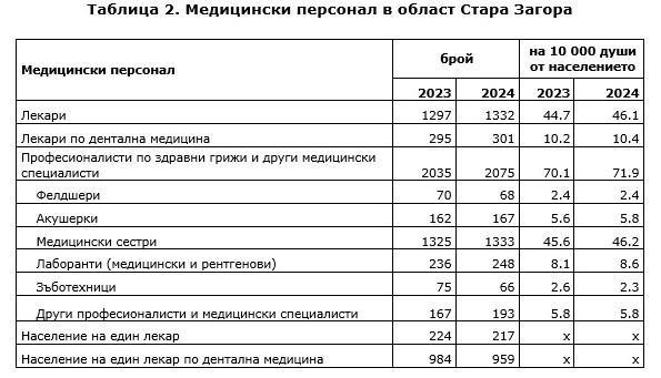 В края на 2024 г. на основен договор в лечебните и здравните заведения в областта практикуват 1 332 лекари (табл. 2). Лекарите по дентална медицина са 301, а професионалистите по здравни грижи и другите медицински специалисти са 2075, от които 1 333 медицински сестри и 167 акушерки.
