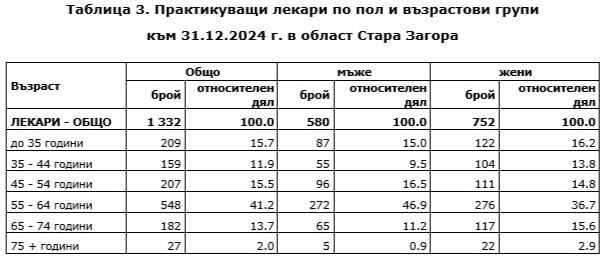 В структурата на лекарите по възраст най-голям е броят и делът им във възрастовата група 55 - 64 години – 548, или 41.1%. На второ място е групата на най-младите практикуващи лекари, на възраст до 35 години – 209, или 15.7%. Най-възрастните лекари (на 75 и повече години) са 27, или 2.0% (виж табл. 3).