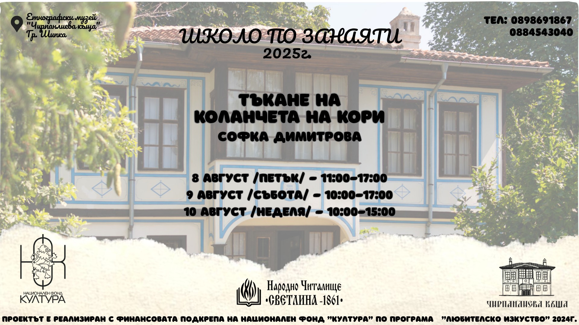 В края на седмицата, от 8 до 10 август в Етнографски музей „Чирпанлиева къща“, гр.Шипка ще бъде представен занаята “Тъкане на колани на кори“ под вещото ръководство на майстор Софка Димитрова, с която ще имате възможността да се научите да тъчете коланчета.