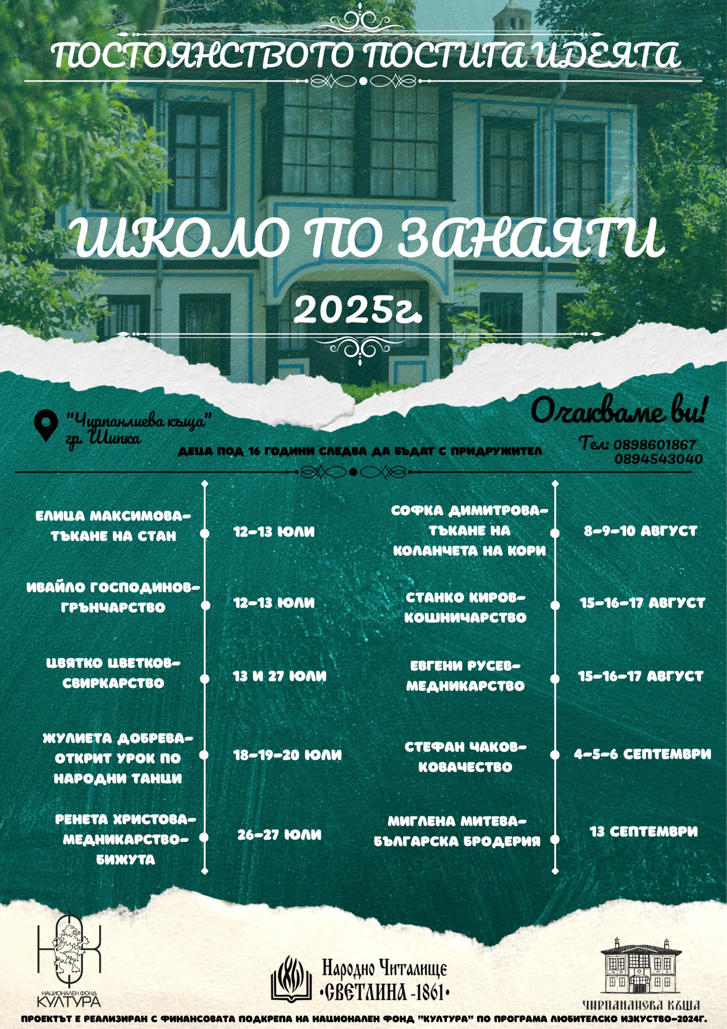 До момента в Етнографски музей „Чирпанлиева къща“ бяха представени занаятите тъкачество, грънчарство, свикарство, медникарство (изработка на бужута), както и открит урок по народни танци. В следващите седмици посетители на Школóто по занаяти ще могат да се включат в различни ателиета: кошничарство със Станко Кирилов и медникарство с Евгени Русев (15-17 август), ковачество (4-6 септември) със Стефан Чаков, както и в изработката на българска бродерия с Миглена Митева на 13 септември.