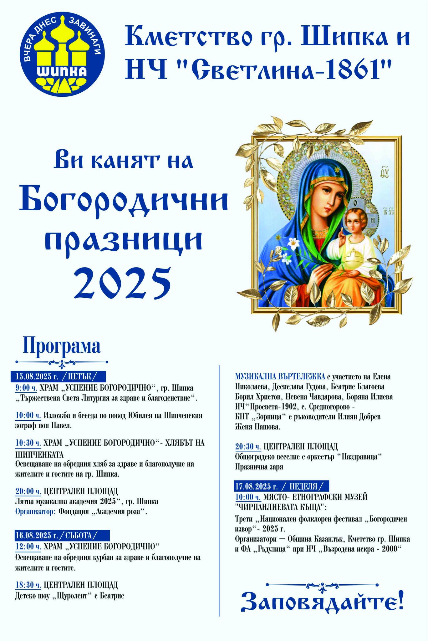 10:00 Етнографски музей „Чирпанлиева къща“ - Трети Национален фолклорен фестивал „Богородичен извор“ – 2025 г., организатор: Община Казанлък, Кметство гр. Шипка и ФА „Гъдулица“ при НЧ „Възродена искра – 2000“