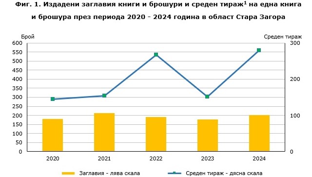 В сравнение с 2023 г. броят на издадените заглавия на книги се увеличават с 14.2%, а средният тираж на една книга за областта през 2024 г. е 279 броя, като през предходната година е бил 151.