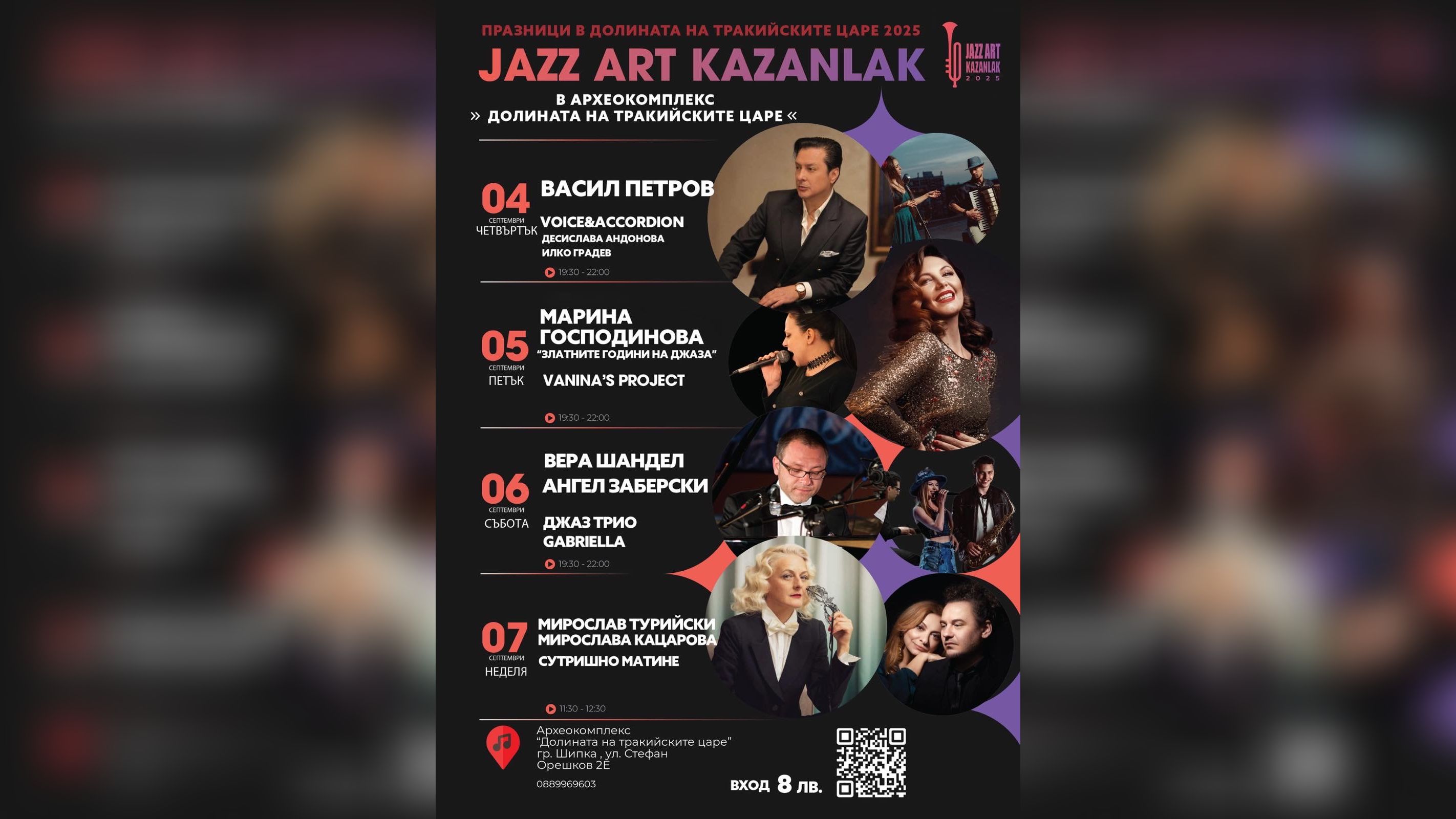 От 4 до 7 септември 2025 г. Казанлък отново ще се превърне в столица на джаза - в Археокомплекс Долината на тракийските царе ще се изявят едни от най-известните български и световно признати джаз музиканти.