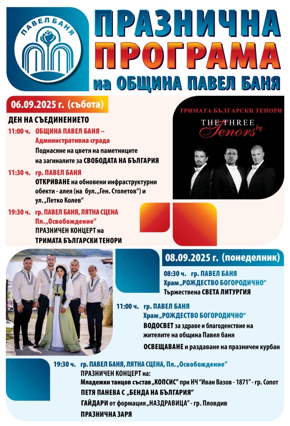 Павел баня ще отпразнува Деня на съединението и храмовия си празник с музикалните изпълнения на “Тримата Български Тенори” и ангелогласната Петя Панева.