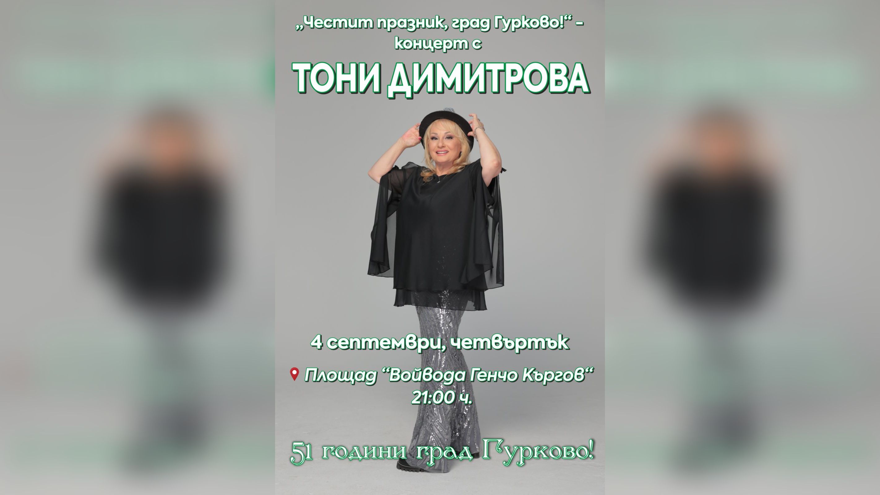 21:00 ч. – Концерт „Честит празник, град Гурково!“ с Тони Димитрова