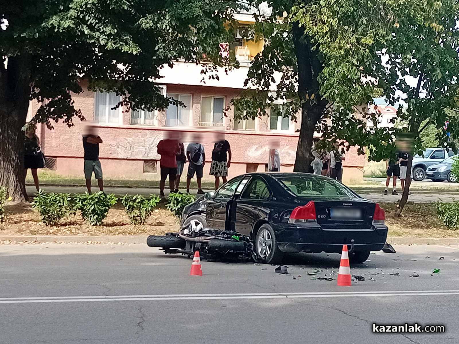 Днес, в 15:37 часа е получен сигнал за пътнотранспортно произшествие на бул. „23-ти Пехотен Шипченски полк“ в Казанлък. По първоначална информация същото е между мотоциклет и лек автомобил, управляван от бременна 24-годишна жена, съобщиха от полицията.