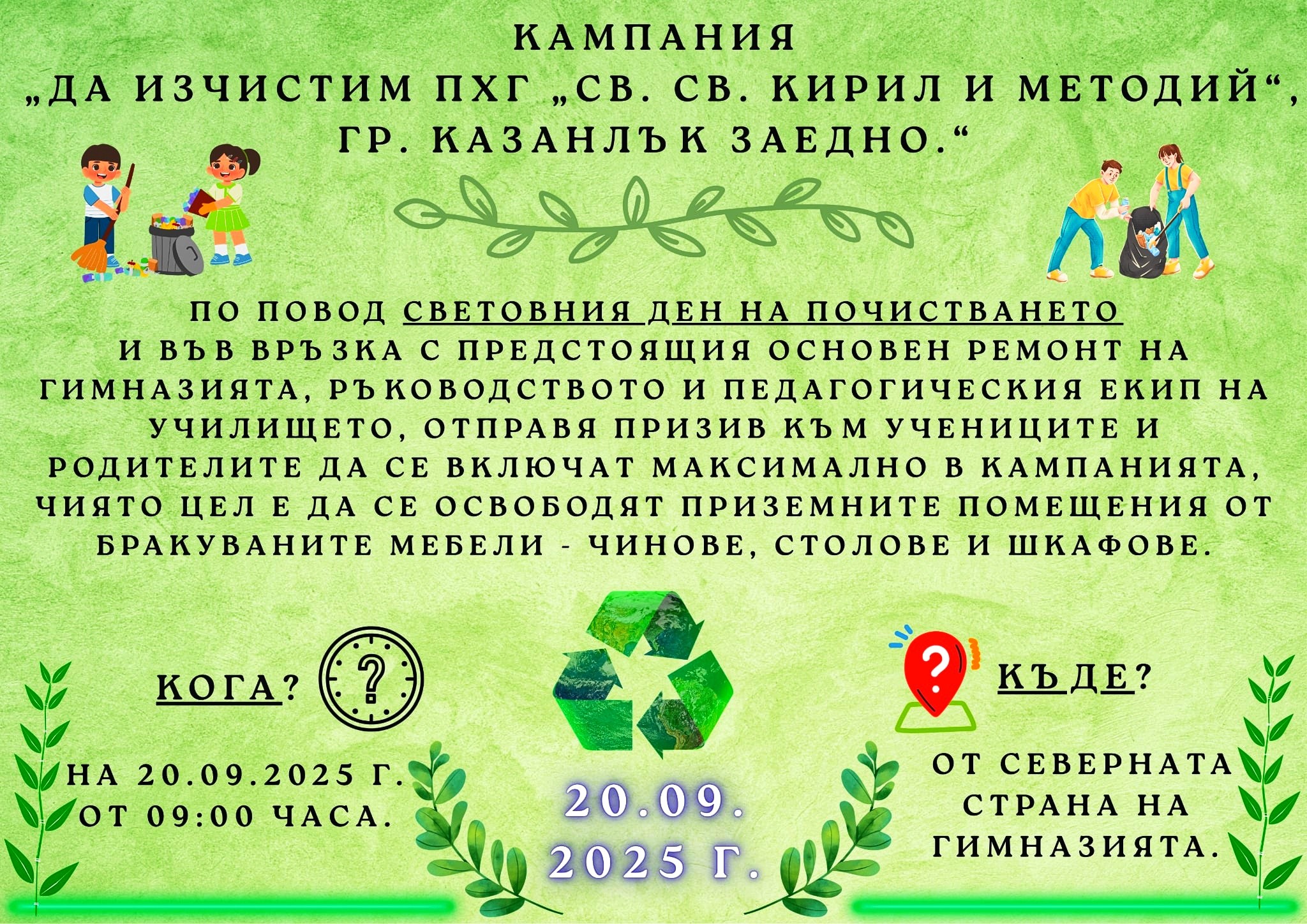 Инициативата ще се проведе на 20.09.2025 г. от 09:00 часа, на сборна точка - северната страна на училището. Със старта на почистването ще се разчистят старите чинове, столове и шкафове от приземните етажи.