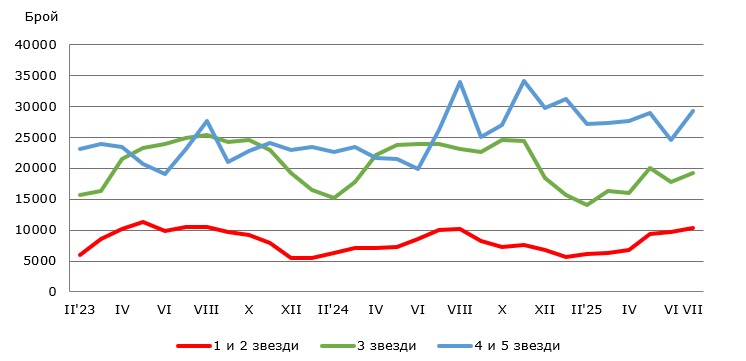 Общата заетост на леглата в местата за настаняване през юли 2025 г. е 34.9%, като намалява с 4.6 процентни пункта в сравнение с юли 2024 година. Най-висока е заетостта на леглата в местата за настаняване с 4 и 5 звезди - 46.7%, следват местата за настаняване с 3 звезди - 35.0%, и с 1 и 2 звезди - 20.4%.