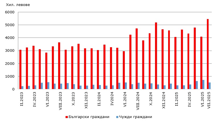 Приходите от нощувки през юли 2025 г. достигат 5.5 млн. лв., или с 28.6% повече в сравнение с юли 2024 година. Отчетен е ръст на приходите от български граждани - с 28.2%, a при чуждите граждани - с 33.2%.
