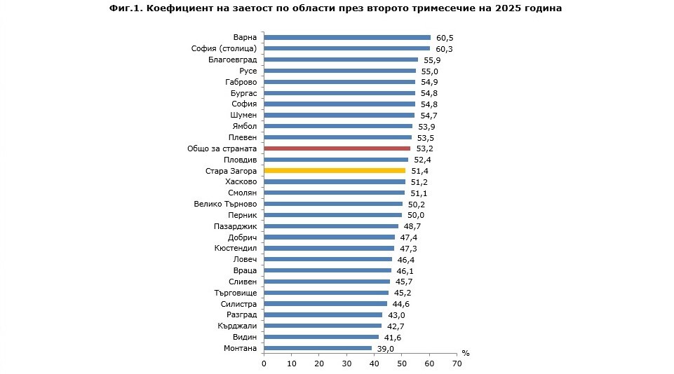 През второто тримесечие на 2025 г. общият брой на заетите лица в област Стара Загора е 126.1 хил., от които 68.7 хил. са мъже и 57.4 хил. са жени.