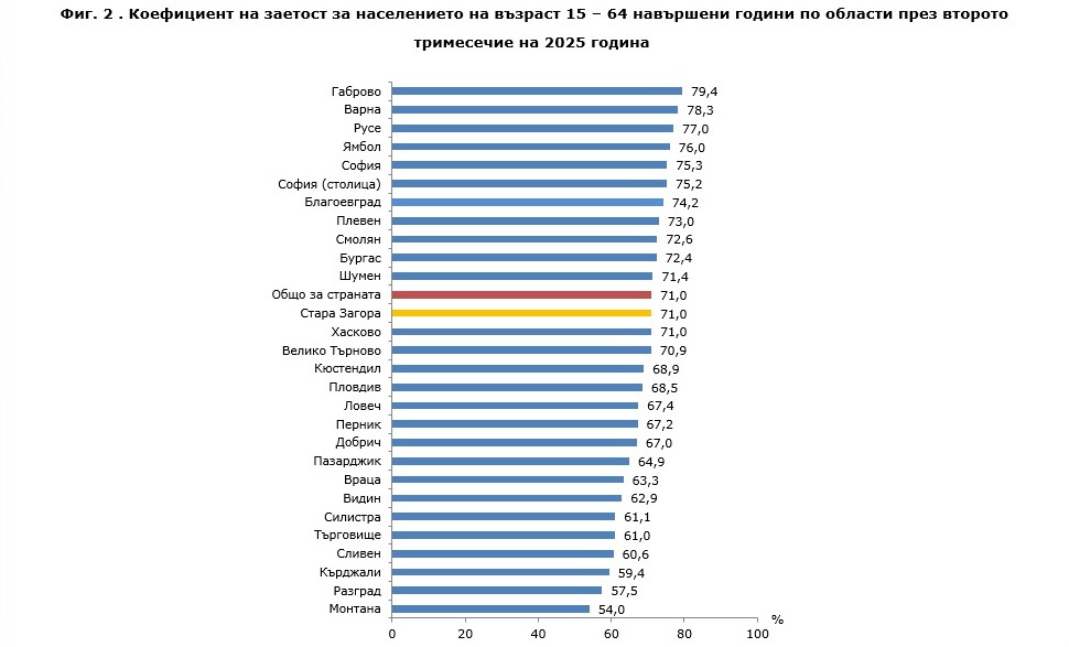 През второто тримесечие на 2025 г. общият брой на заетите лица във възрастовата група 15 – 64 навършени години в област Стара Загора е 123.3 хил., от които 66.9 хил. са мъже и 56.3 хил. – жени. Коефициентът на заетост на населението в същата възрастова група е 71.0%, съответно 75.9% за мъжете и 66.0% за жените.