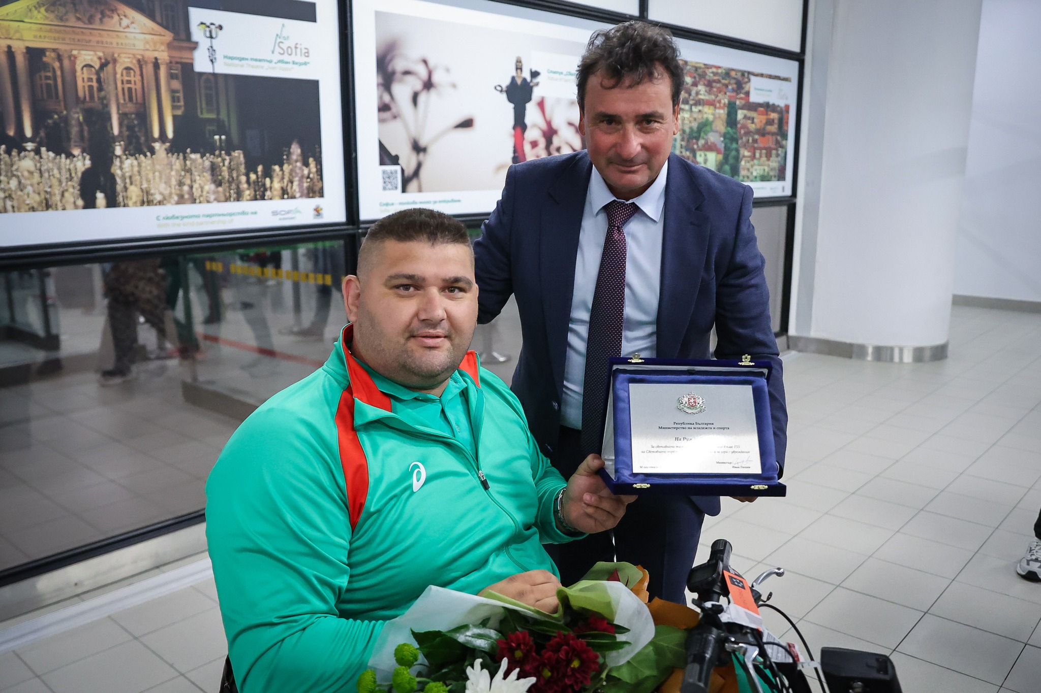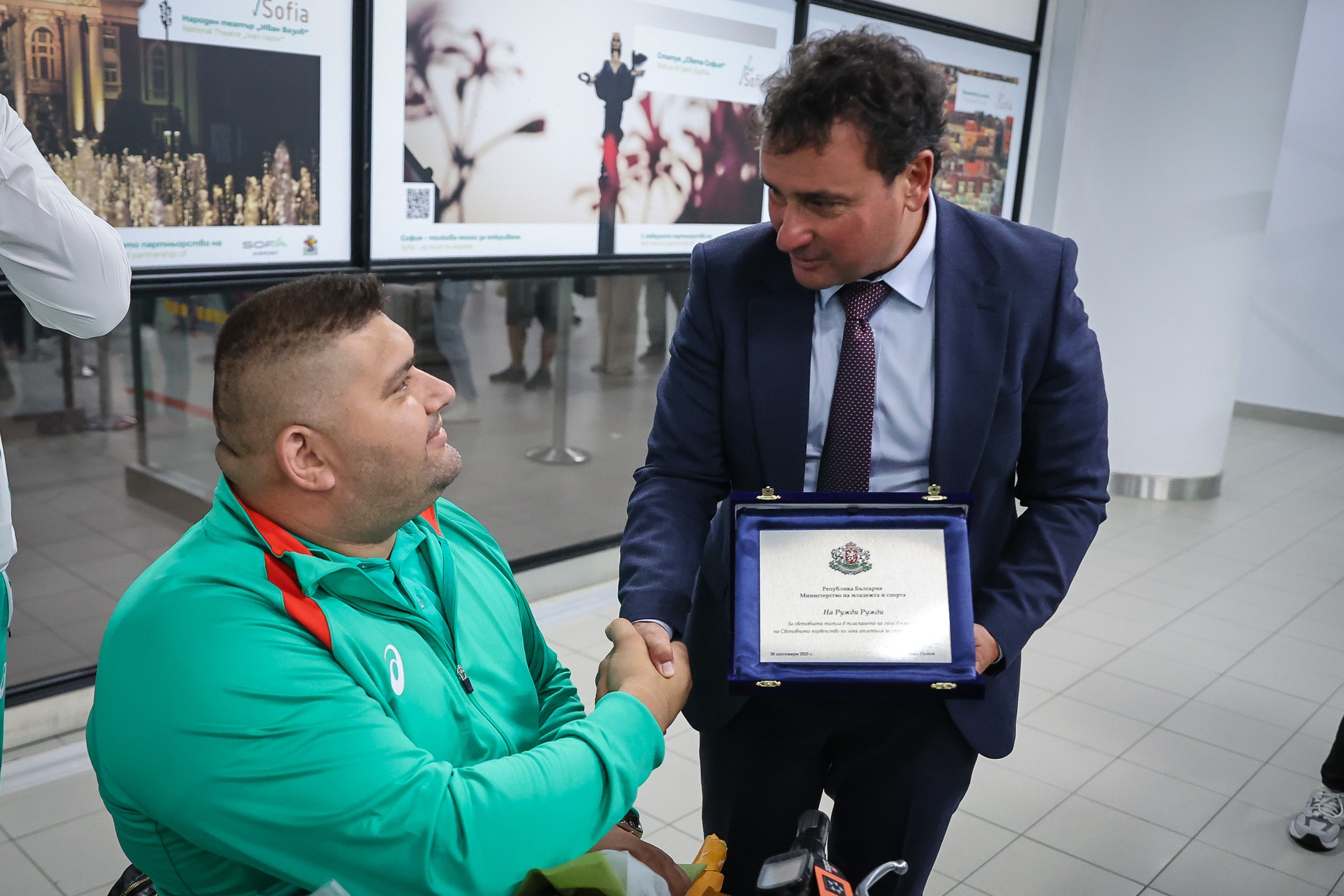 Заместник-министърът на младежта и спорта Димитър Георгиев посрещна на летище „Васил Левски“ световния шампион по лека атлетика за хора с увреждания Ружди Ружди, който се завърна от Световното първенство в Делхи, Индия.
