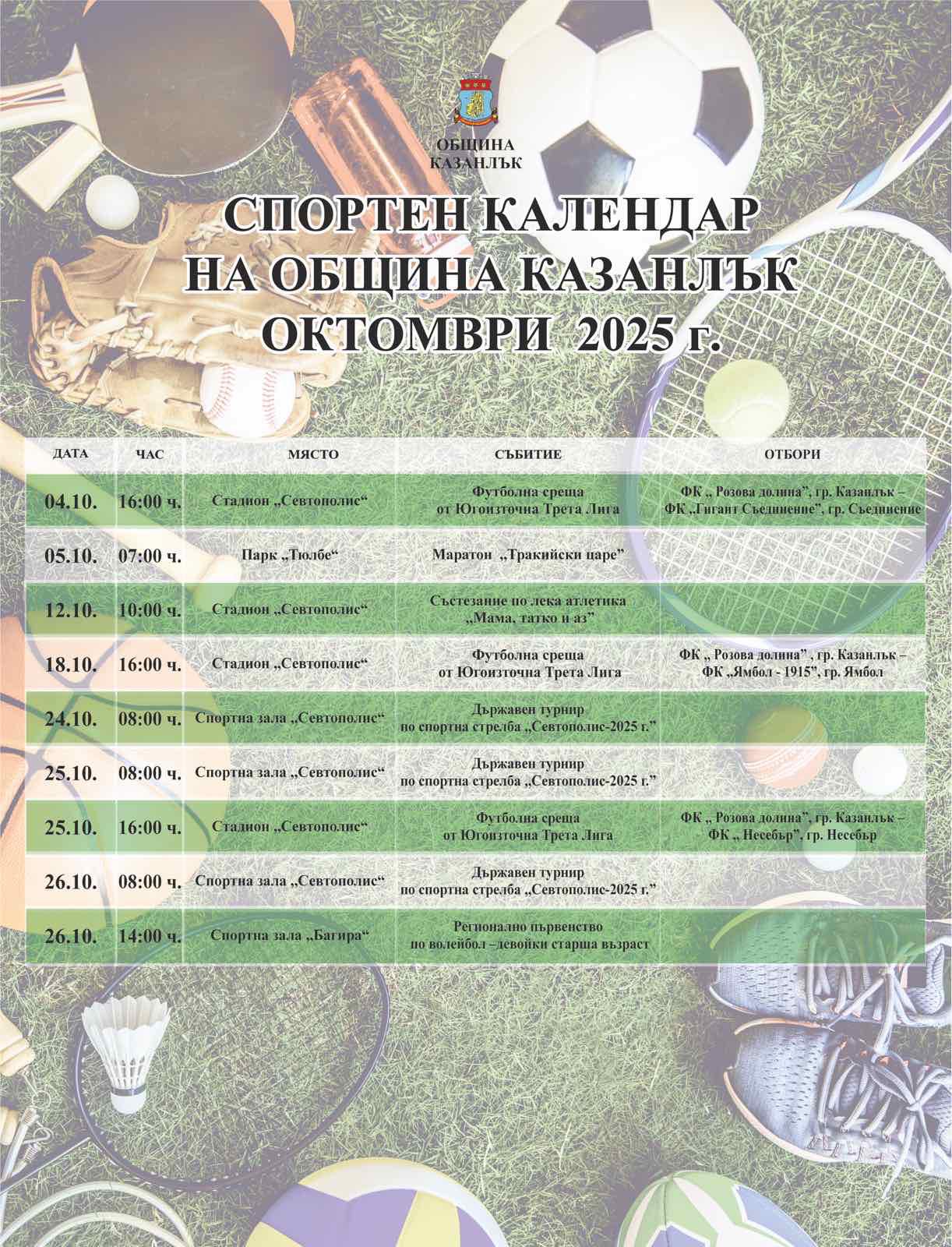 Община Казанлък представи своя спортен календар за октомври 2025 година, който предлага разнообразие от събития за почитателите на футбола, леката атлетика, спортната стрелба, волейбола и маратоните.