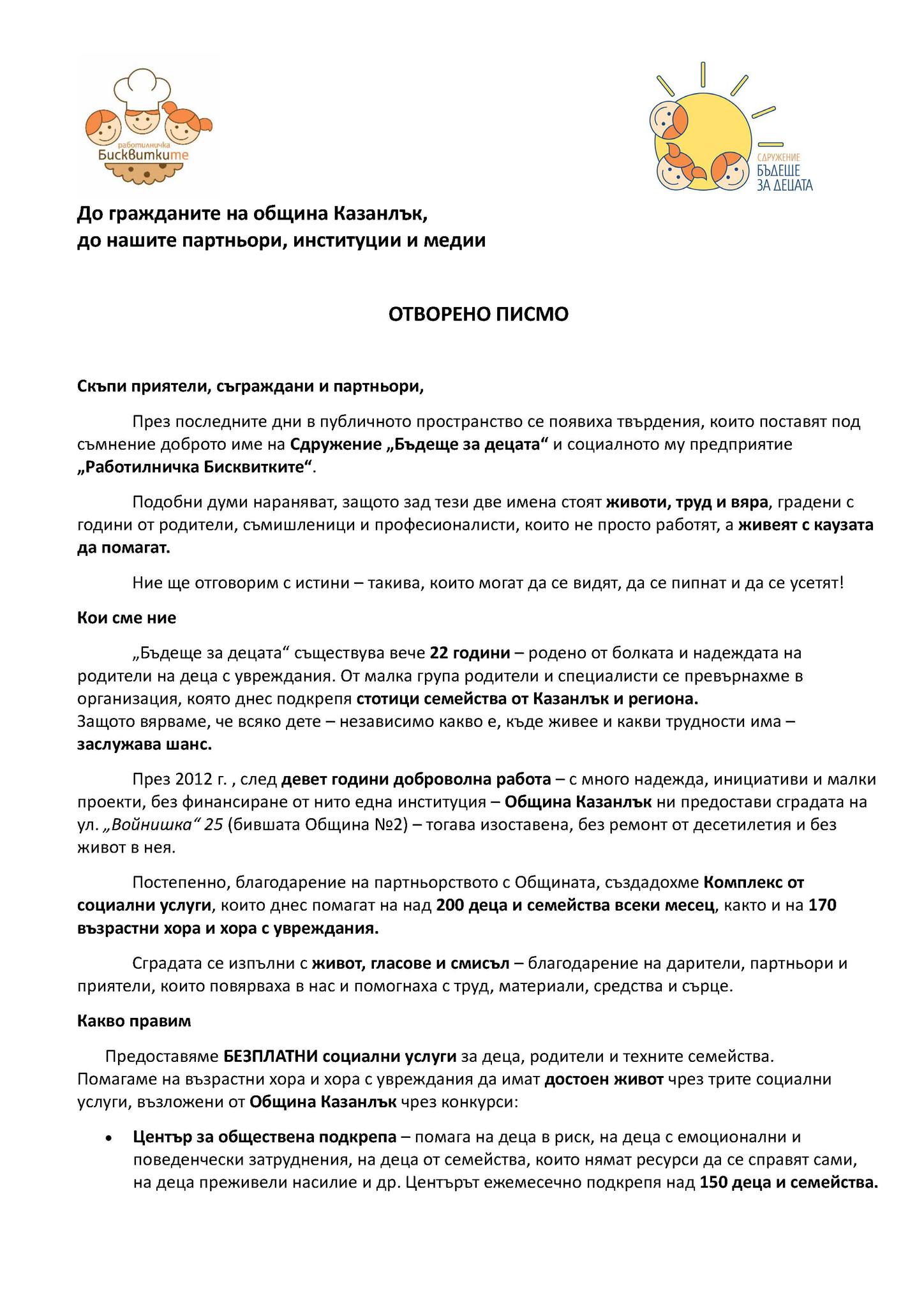 Сдружение "Бъдеще за децата" и Работилничка "Бисквитките" с отворено писмо