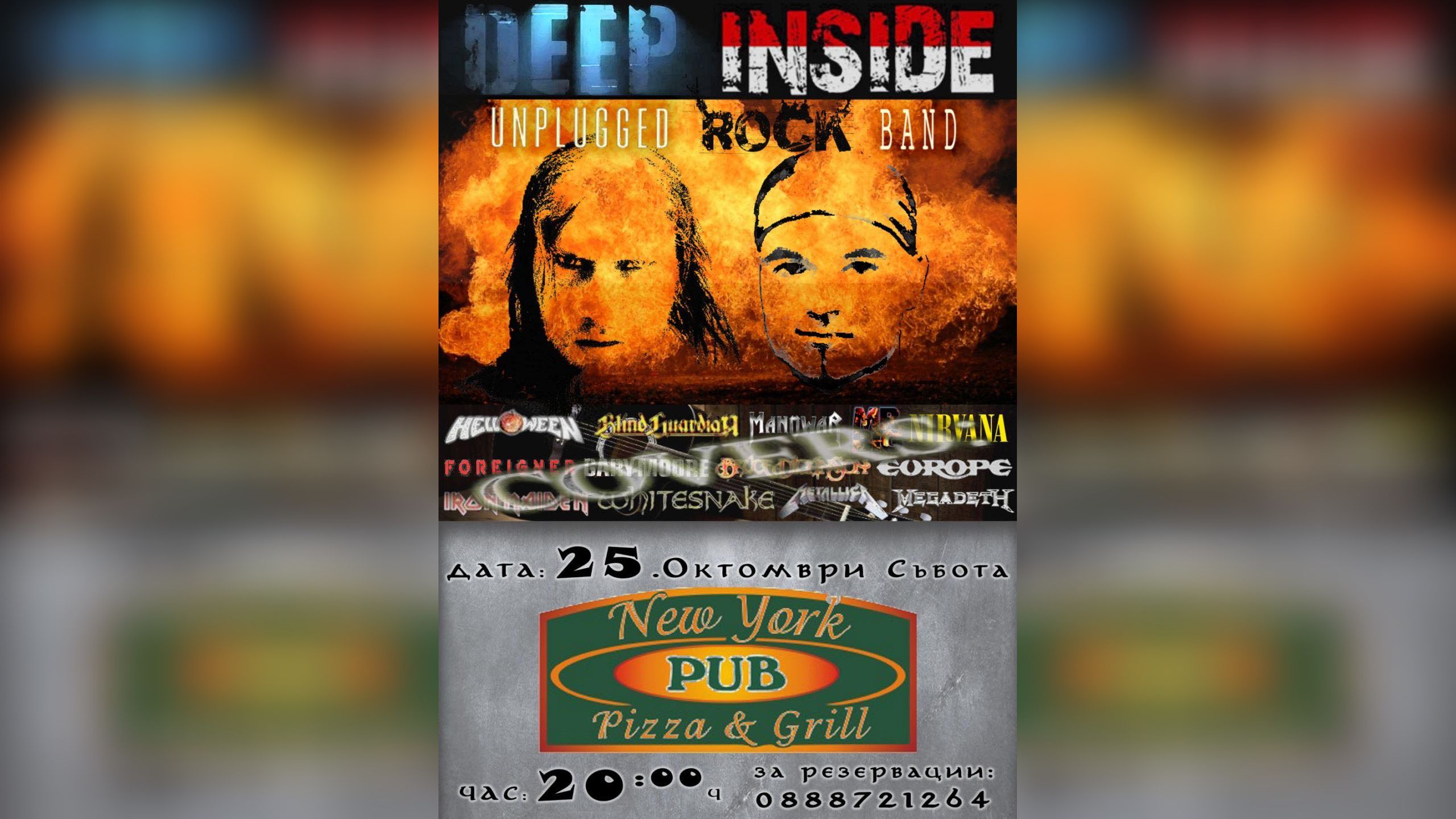 Любителите на рок музиката ще могат да се насладят на незабравима вечер с групата DEEP INSIDE Unplugged Rock Band на 25 октомври (събота) от 20:00 ч. в New York Pub Pizza & Grill – Казанлък.