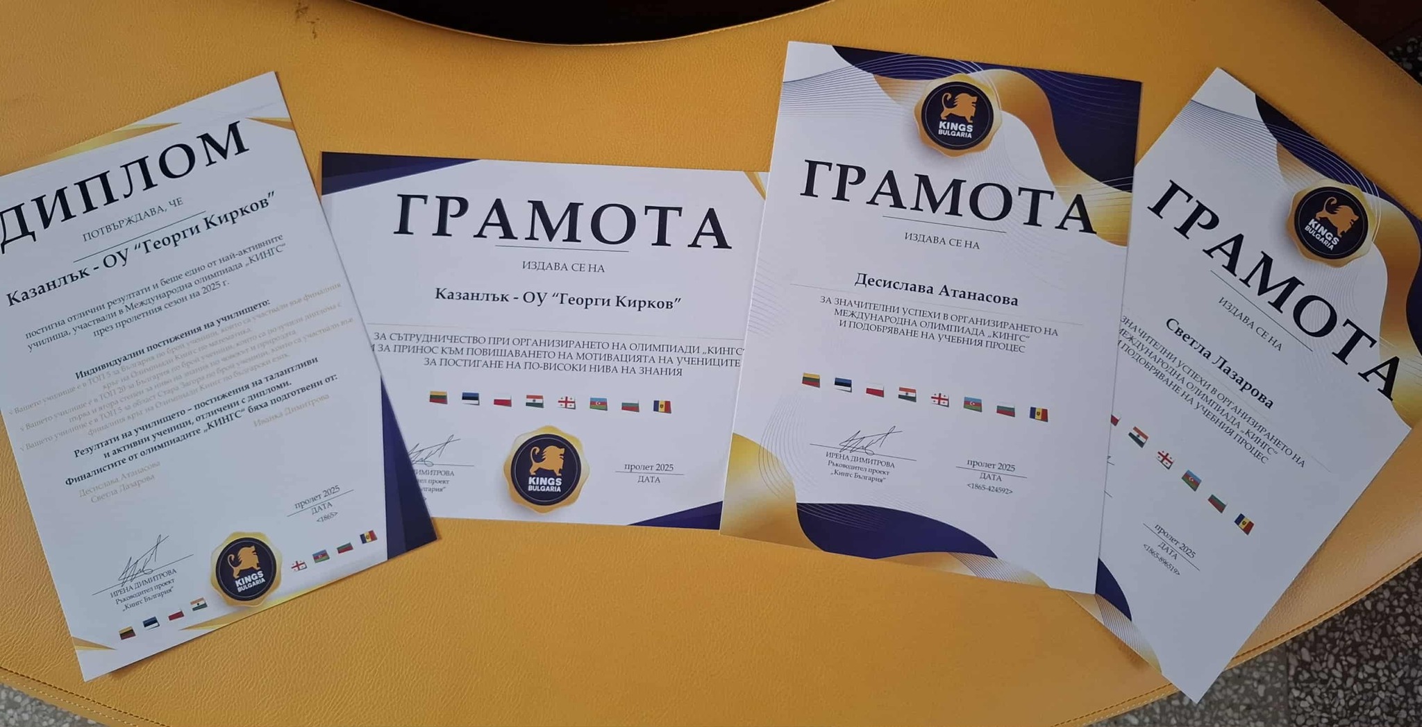 За поредна година учениците от 2.б, 3.б и 3.в клас на ОУ " Георги Кирков" - гр. Казанлък, взеха участие в пролетния сезон 2025 г. на олимпиади "Кингс". Децата показаха отлични знания във всички 7 дисциплини и завоюваха рекорден брой дипломи за първо място.
