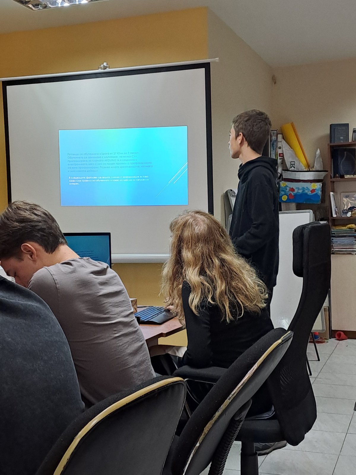 В обширна презентация инж. Радостина Кацарова припомни проектите на ИКТ Центъра по програма "Еразъм+" и наблегна на решаващата им роля за успехите на Центъра за професионално обучение и Детската академия към ИКТ Център, както и за професионалното ориентиране на учениците. По-специално внимание отдели на последния проект при който 12 ученика с двама придружаващи учители учиха образователна роботика с Arduino микроконтролер в Брага, Португалия. В рамките на същия проект 7 учители наблюдаваха работата и споделяха опит с португалски организации в същия град, свързани с роботика и технологии. В тази връзка отново през тази учебна година стартираме обучение на ученици от 7-10 клас по роботика с Arduino.