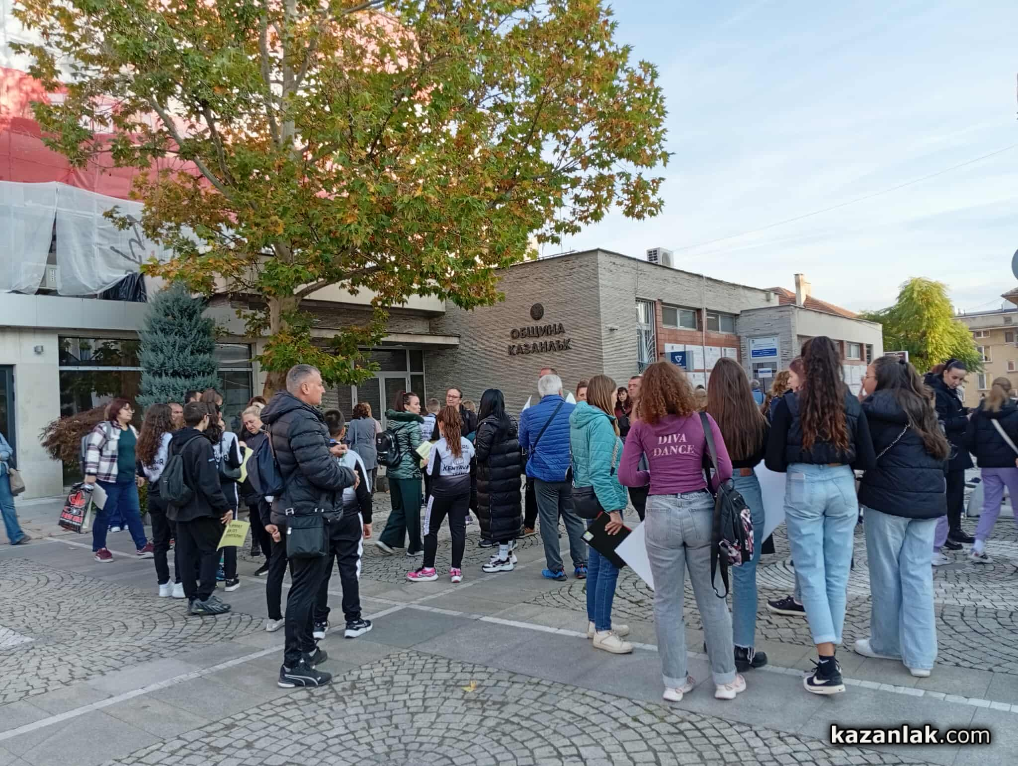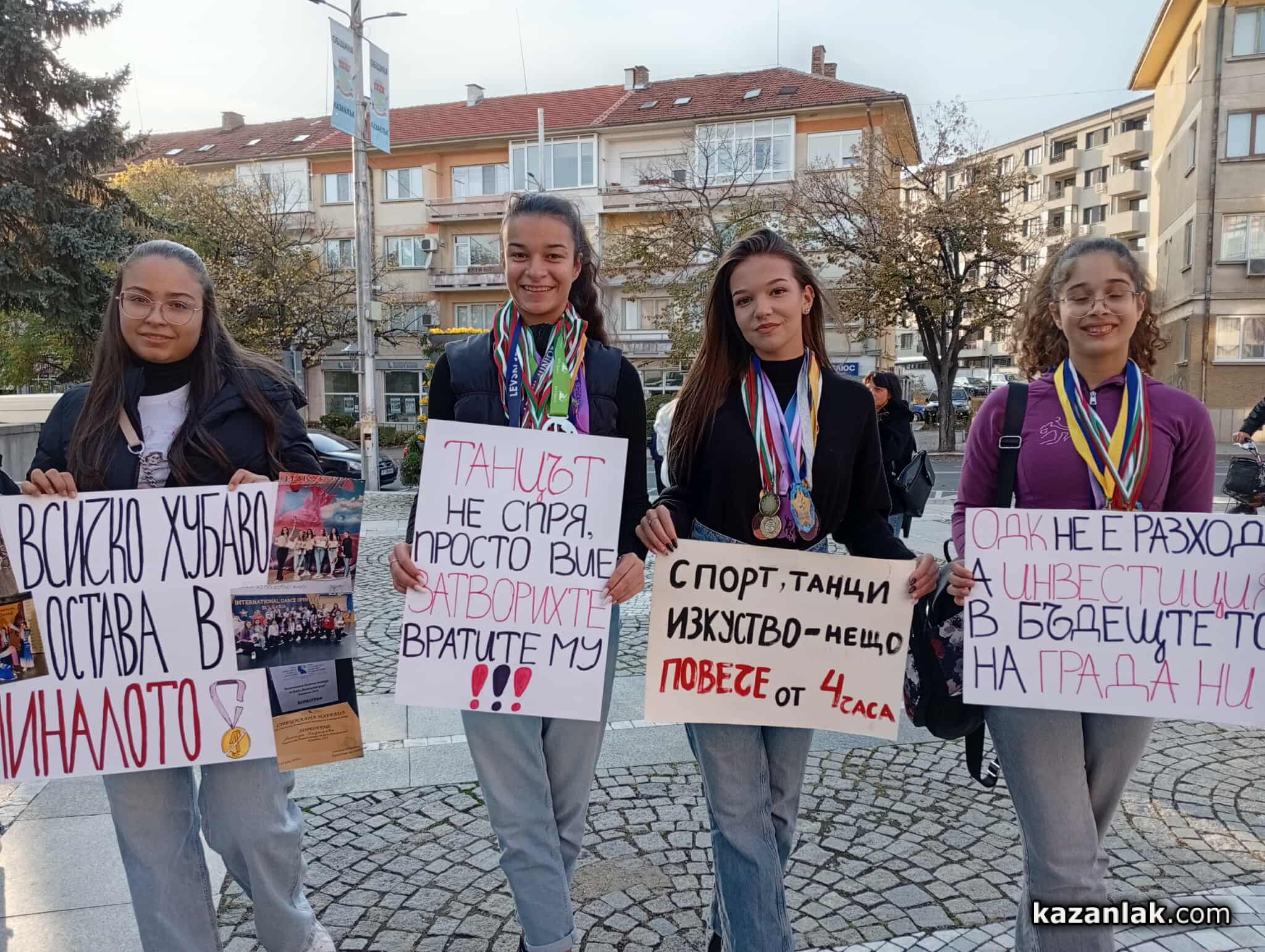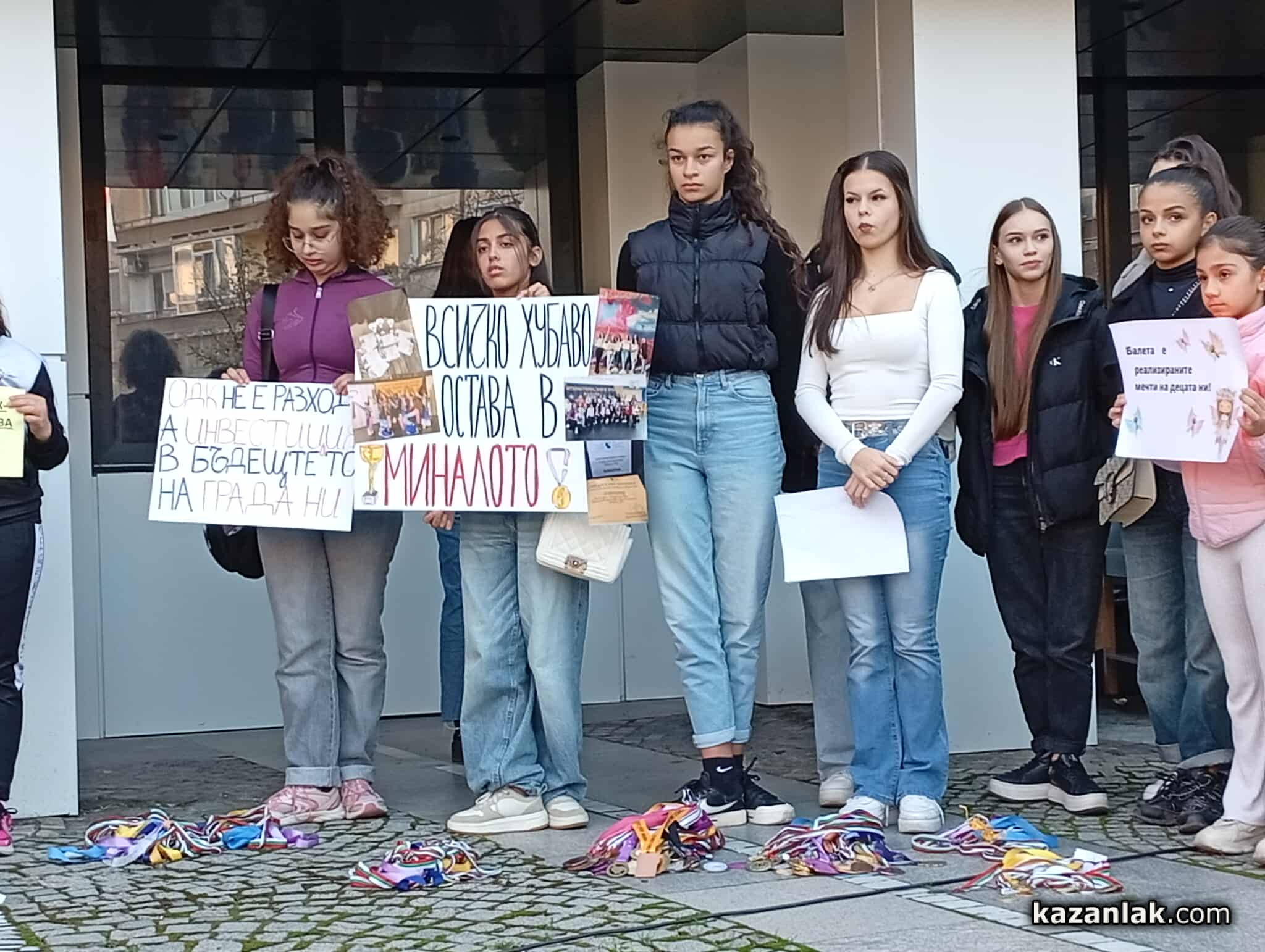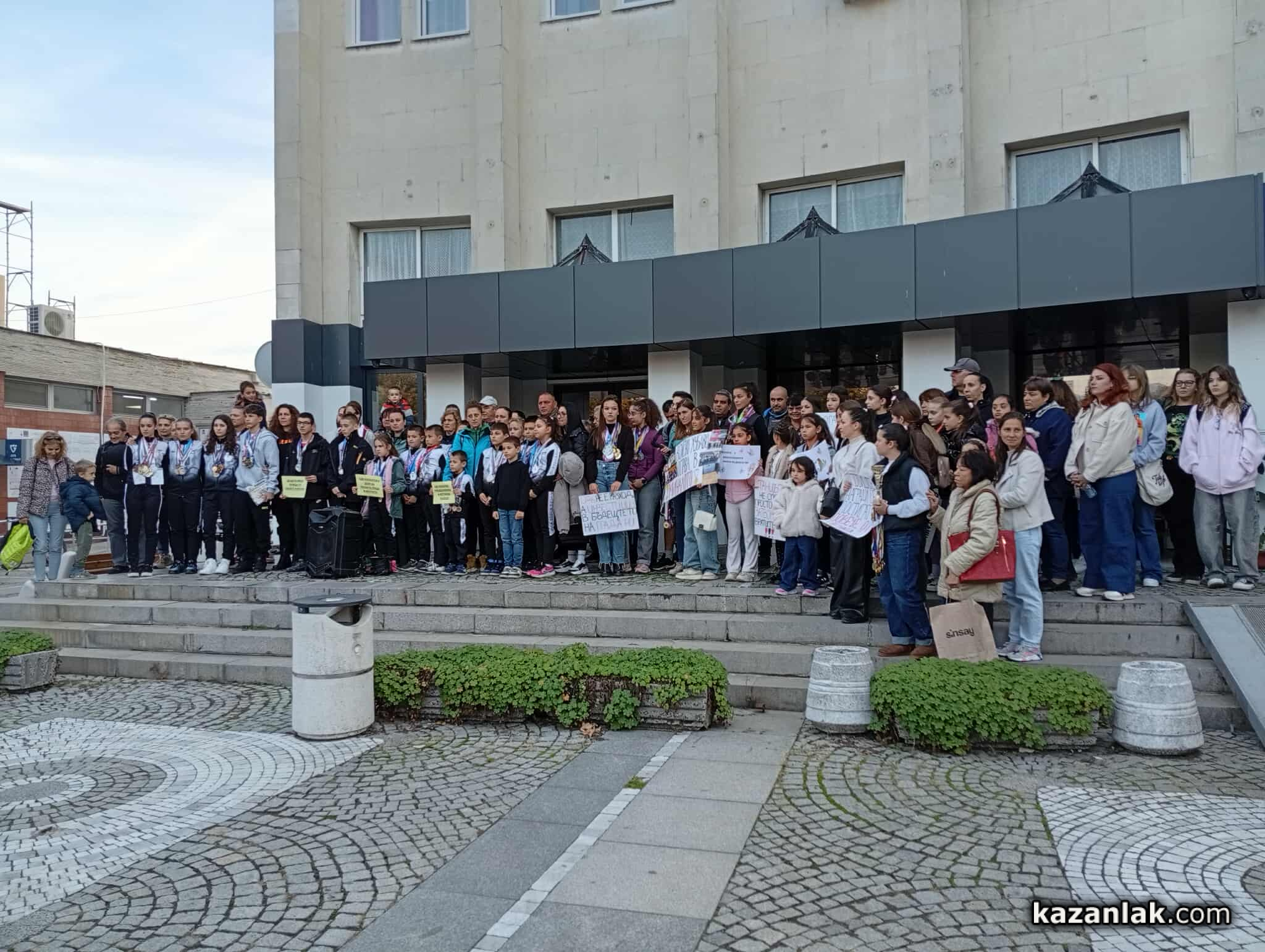 Днес пред сградата на община Казанлък граждани, родители и деца, посещаващи заниманията в Общински детски комплекс "Свети Иван Рилски", протестираха срещу намерението за намаляване на щатовете от 8 работни часа на 4 часа.