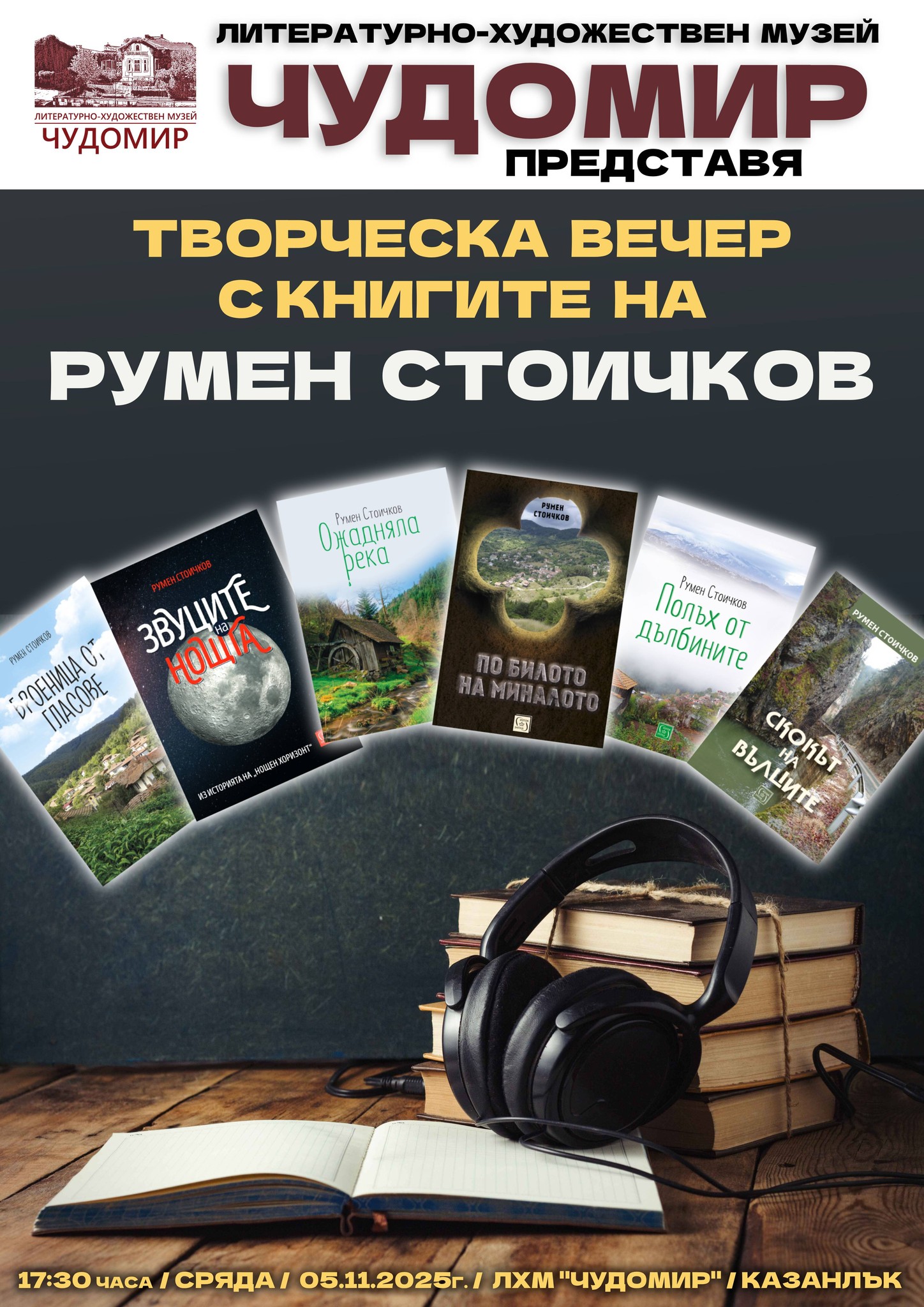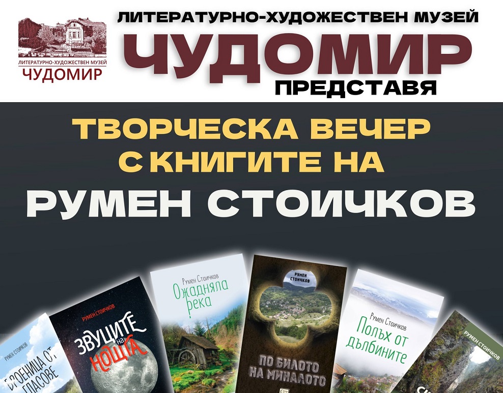 Тази вечер, от 17,30 ч., в ЛХМ "Чудомир" ще се проведе вълнуваща творческа вечер с книгите на писателя и журналист Румен Стоичков – дългогодишен водещ на предаването „Нощен хоризонт“ по БНР и автор на книги „Скокът на вълците“, „Ожаднялата река“, „Звуците на нощта“ и други.