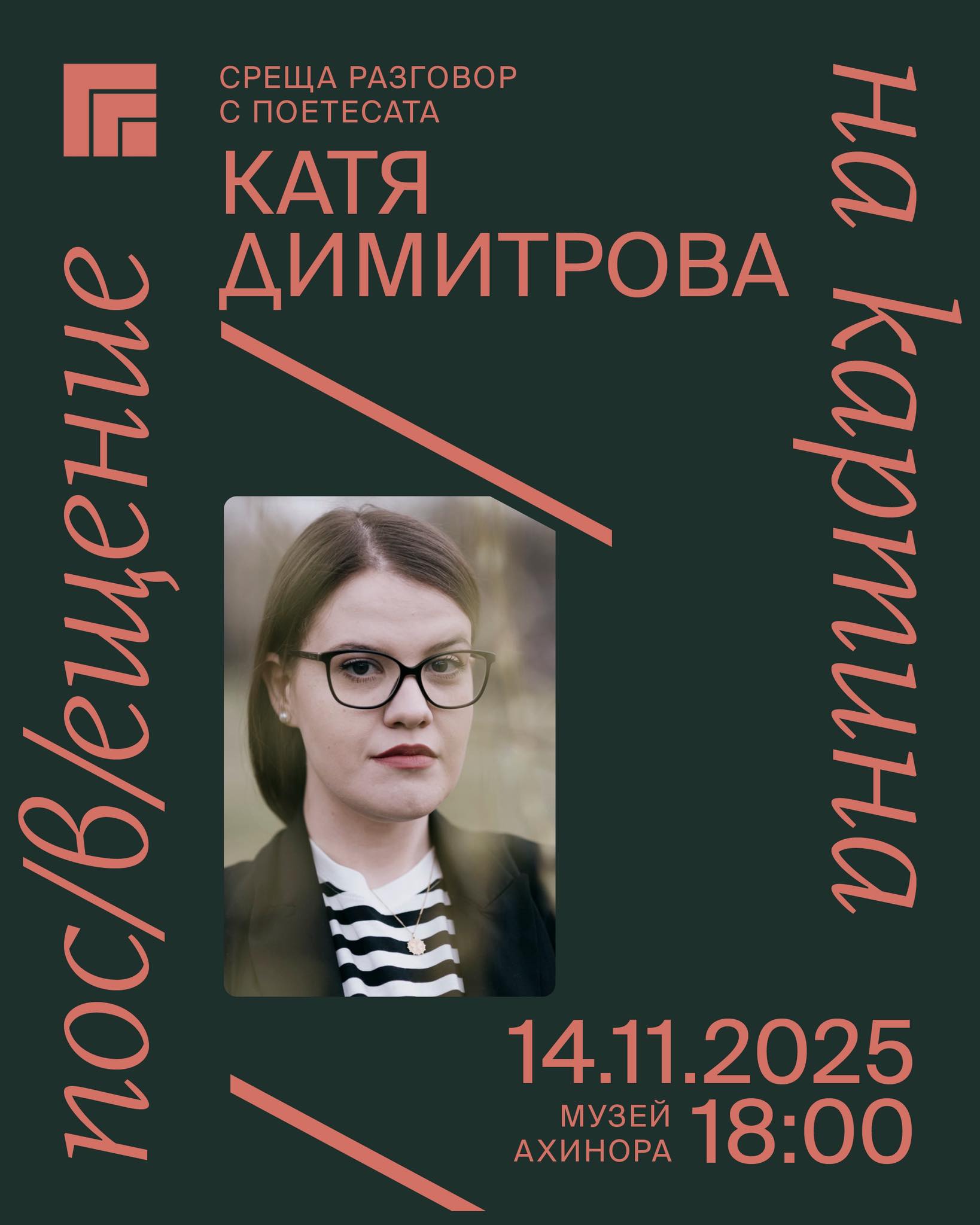 На 14 ноември 2025 г., от 18:00 ч. в музей „Ахинора“, ще се проведе среща с поетесата Катя Димитрова, част от поредицата „Посвещение на картина“.