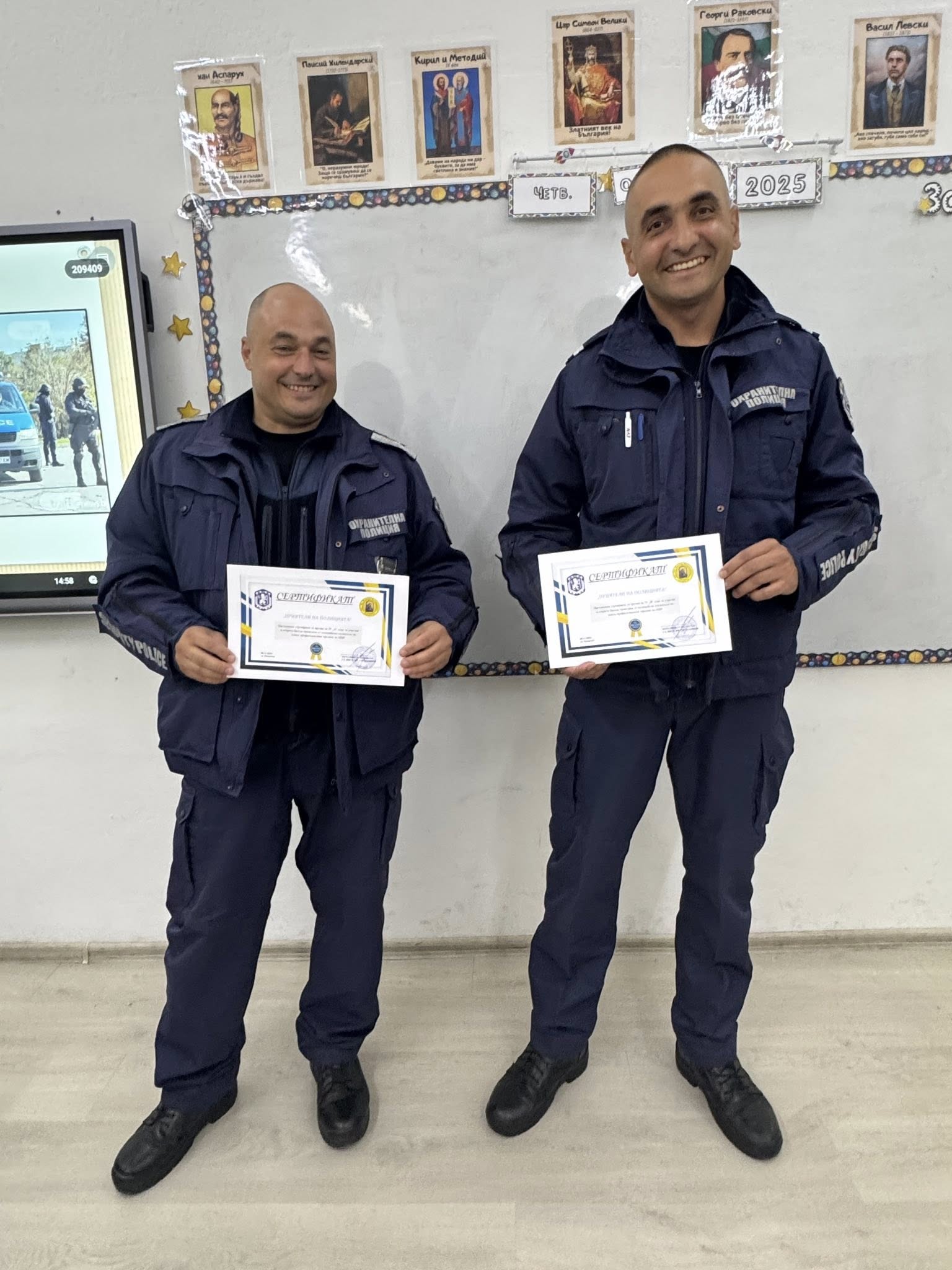 По повод Професионалния празник на полицията учениците от 4.а и 4.в клас на ОУ "Св. Паисий Хилендарски" проведоха беседа с полицейски инспектор Тодор Йовчев и младши инспектор Хюсеин Али. Униформените служители представиха своята професията, разказаха за нейната отговорност и значението ѝ за осигуряване на реда, сигурността и спокойствието в нашето ежедневие.