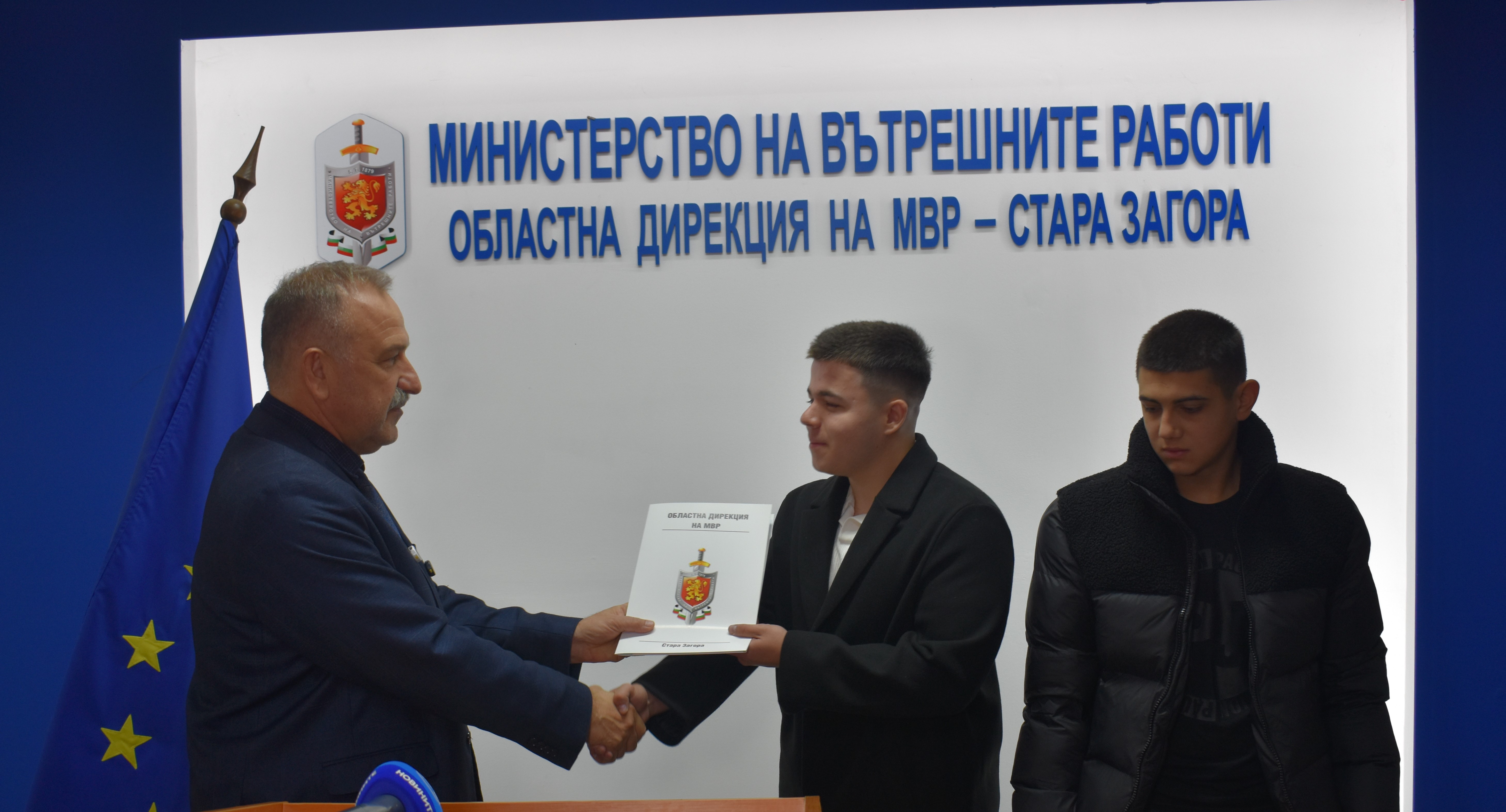 На тържествена церемония, проведена днес в сградата на ОДМВР-Стара Загора директорът на ОДМВР-Стара Загора старши комисар Красимир Христов връчи благодарствени адреси на Христо Денев , ученик в ППМГ „Никола Обрешков“ гр. Казанлък и на Иван Иванов, ученик в Професионална гимназия по транспорт и транспортен мениджмънт в гр. Казанлък.