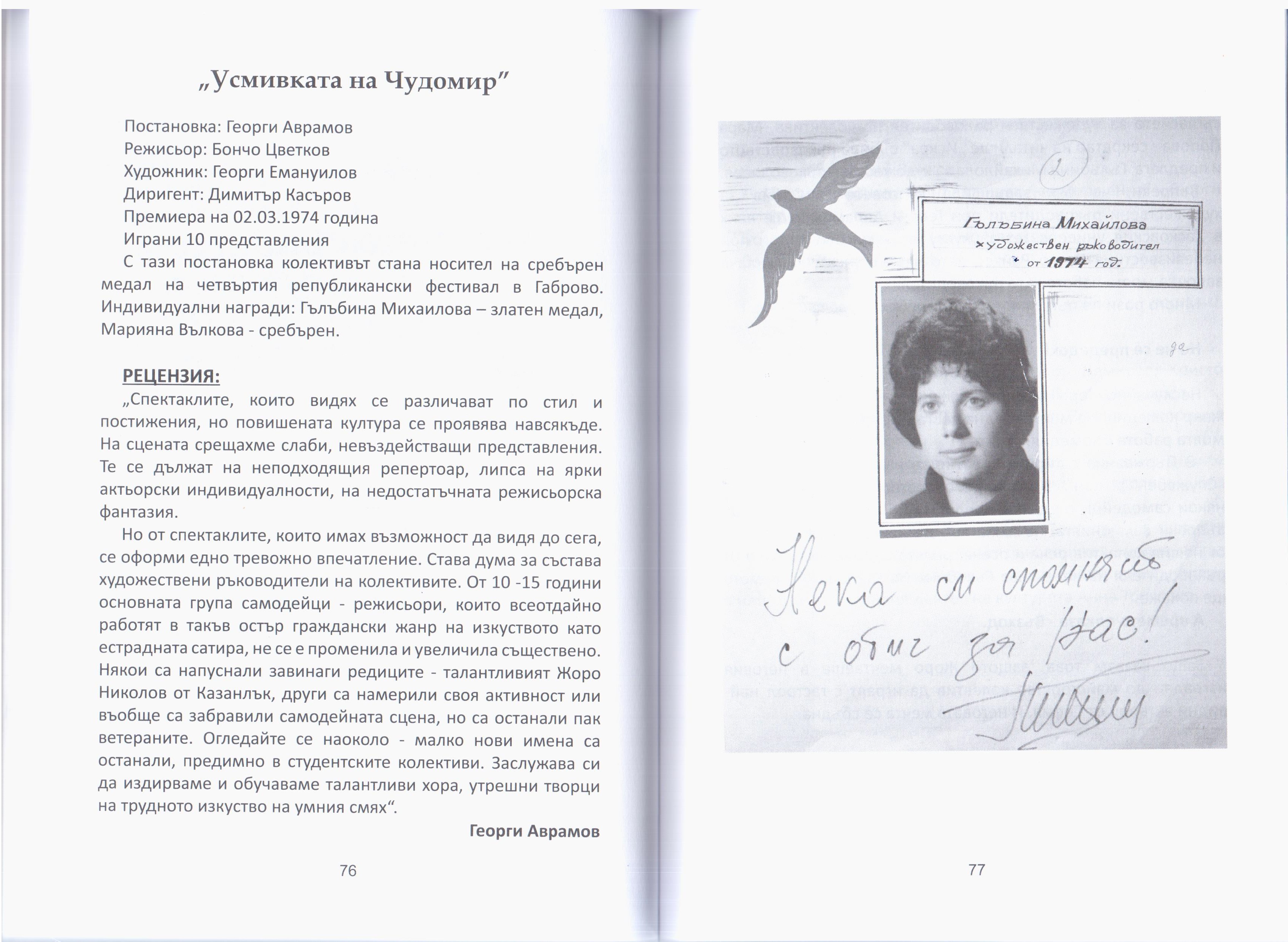 Изключителната Гълъбина Михайлова, която застава начело на сатирата, като главен художествен ръководител след кончината на Жоро, споделя с дълбока признателност: „Всичко, което съм постигнала дотук, го дължа на Жоро”. Гълъбина Михайлова, с присъщата си всеотдайност съхранява и допълва дневника, започнат от Жоро. А в книгата си „60 години казанлъшка сатира” тя изрича пророческите думи: „Любовта между самодейците – сатирици и публика е вечна!”