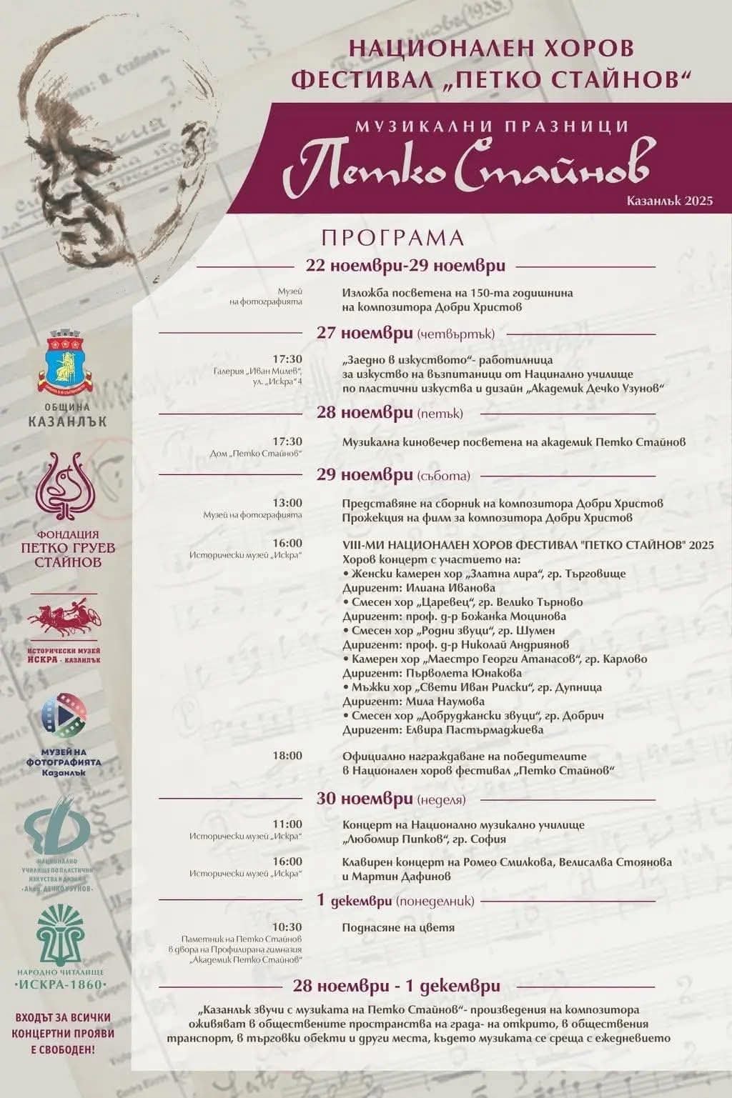 С изложба посветена на 150-та годишнина на композитора Добри Христов ще бъде сложено началото на редица събития в Града на розите от Музикални празници „Петко Стайнов“ 2025г. Изложбата ще бъде открита на 22 ноември, събота, в Музея на фотографията.