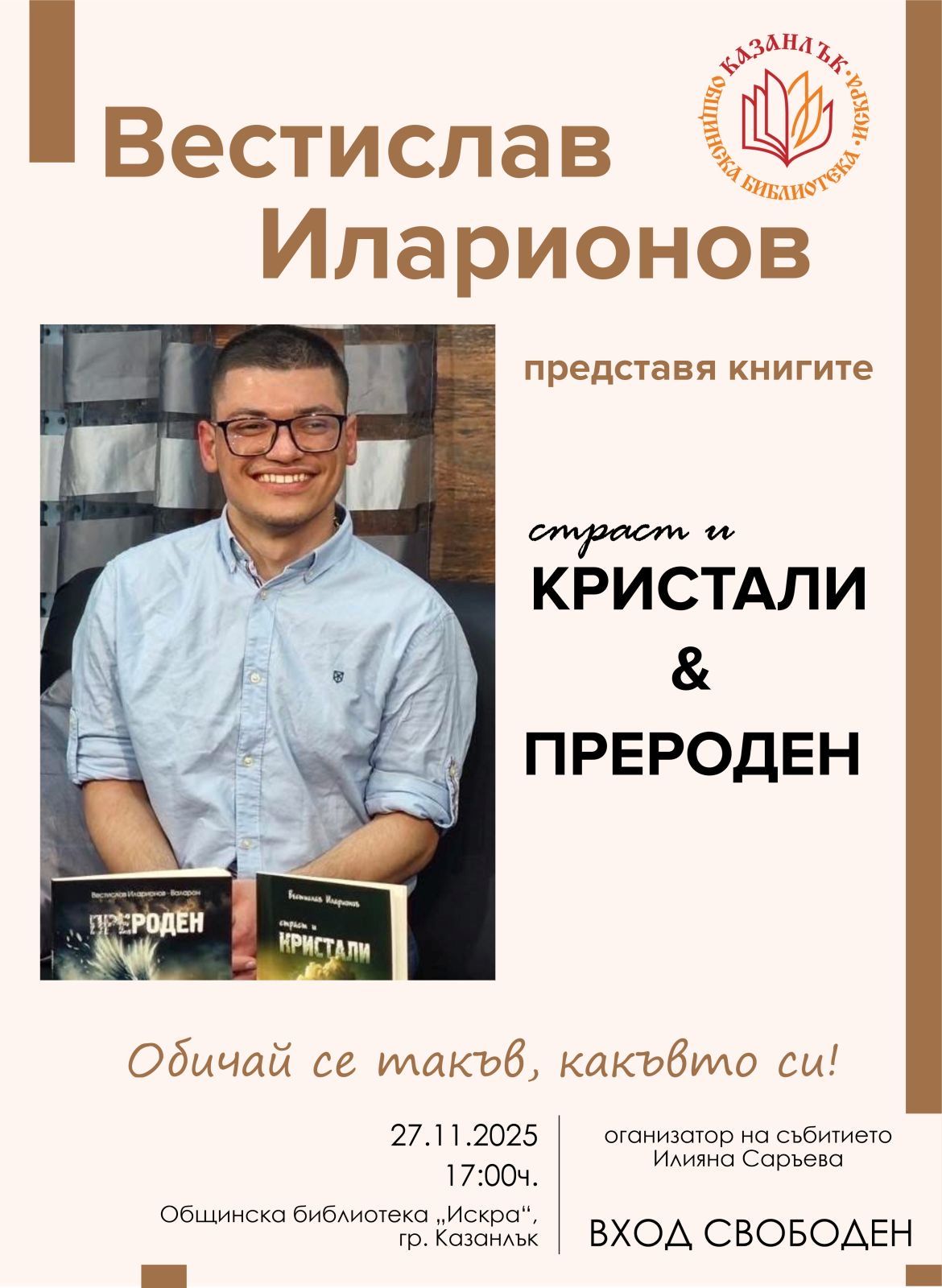На 27 ноември (четвъртък) Вестислав Иларионов ще представи двете си книги „Прероден” и „Страст и кристали”в Общинска библиотека „Искра”, от 17:00 ч. Събитието е с вход свободен и е възможност не само да се запознаете с творчеството му, но и да чуете лично историята му – за пътя, вдъхновението и смисъла, който намира в думите.